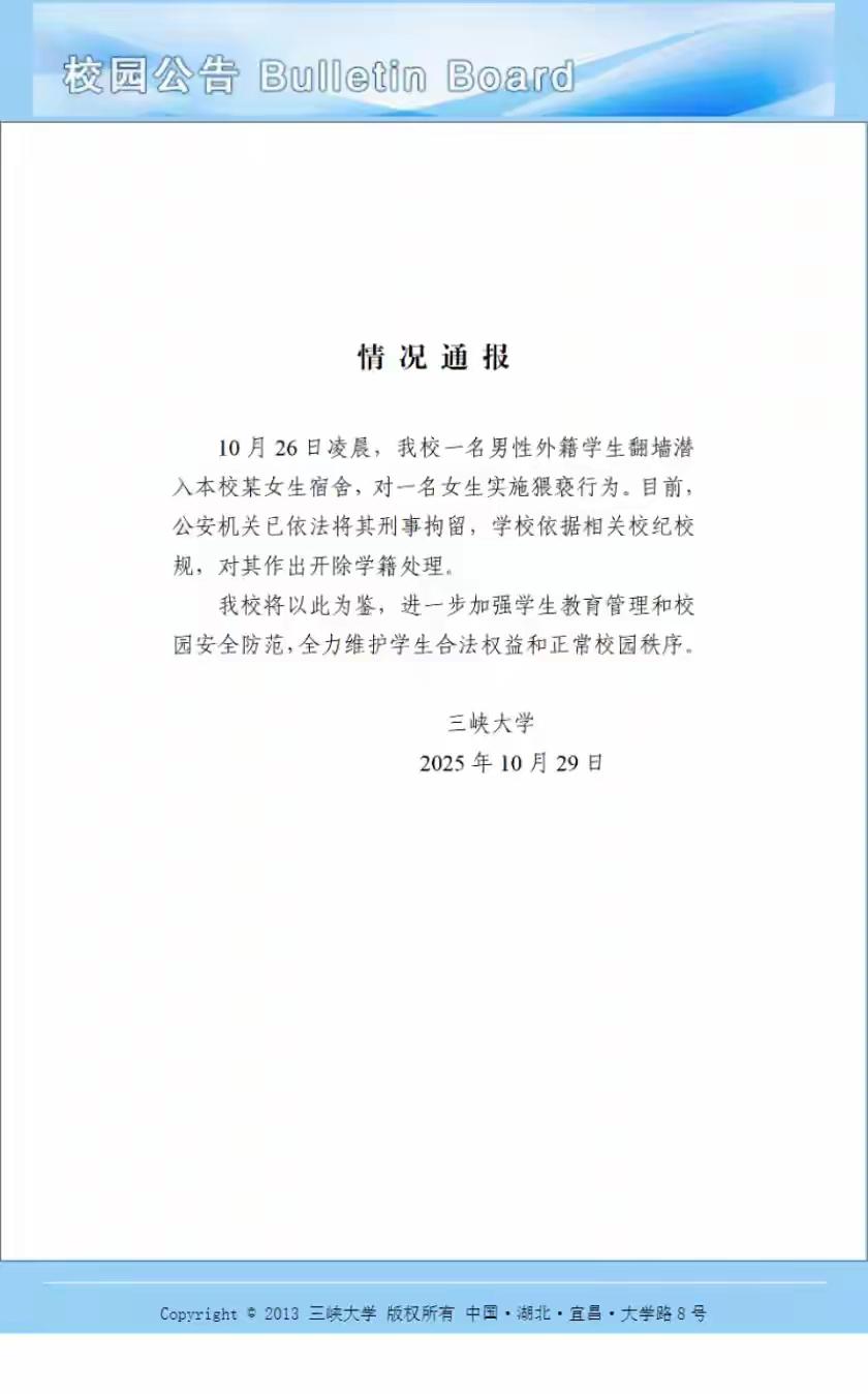 翻墙潜入女生宿舍猥亵女生,这名外籍男生真是色胆包天! 三峡大学通报一名外籍男生翻墙潜入到女生宿舍对一名女生进行猥亵学校报警,对这名外籍男朋进行刑事拘留! 证明外籍男生真是色胆包天在我们中国的学校, 来欺负我们中国的女孩,坚决不能容忍! 这样的人骨子里的坏,是很难改变的, 有的大学生在校园里常常看到一些外来面孔,有时候会躲着走! 如果 是那些奔着来,我们国家学习交流深造的那些学生我们欢迎, 如果来到这里是来欺负我们中国人的,我们国人坚决不答应!有一个算一个,必须绳之以法, 外国人来到我们中国的领土就应该遵守我们中国的法律,中国的法律对于来我国的外国人来说,这里也不是法外之地! 这位外籍的男生真搞不懂你是来中国干嘛的?