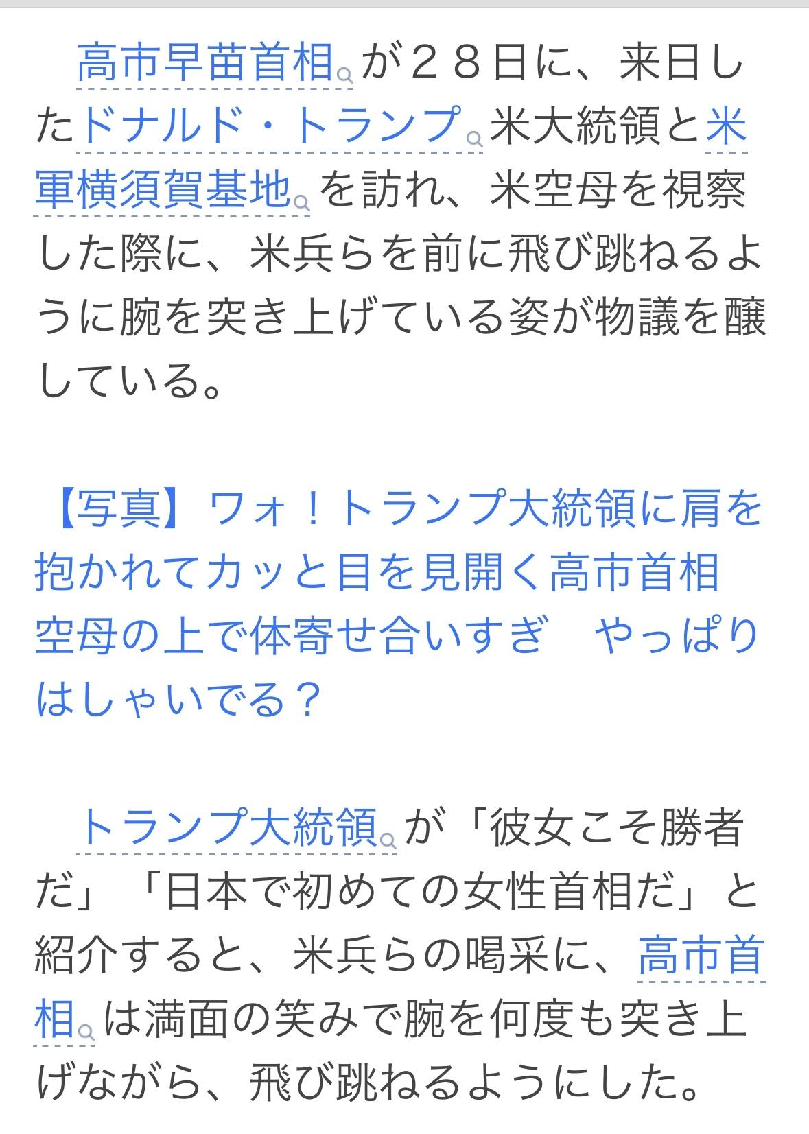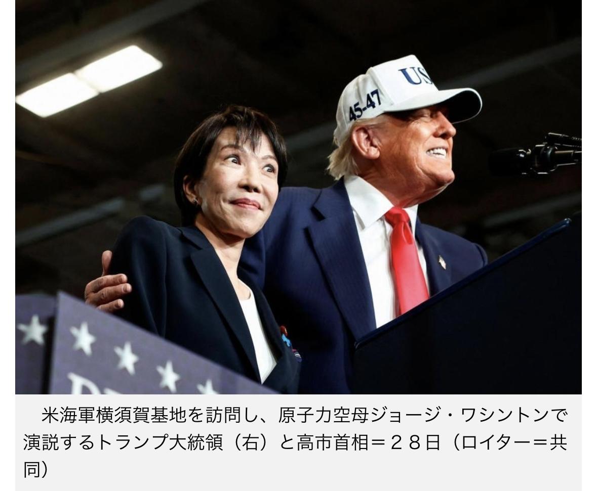 28日,高市陪同特朗普参观了横须贺海军基地,并视察了一艘美国航空母舰。她举起双臂,在美军士兵面前蹦蹦跳跳,引发了争议。“她太激动了”、“首相可是在美国航母上”。 【照片】哇!特朗普总统将手臂搭在高市早苗的肩膀上,她瞪大了眼睛。两人在航母上亲密地依偎在一起。她是不是玩得太开心了? 当特朗普总统称她为“赢家”和“日本首位女首相”时,高市早苗笑容灿烂,在美国士兵的欢呼声中蹦蹦跳跳。 这一标志性画面被电视新闻报道,并在网络上引发热议。“美国军事基地”等相关词汇也成为热门话题。 随之而来的是铺天盖地的批评,例如“日本首相在美军基地内的航空母舰上欢蹦乱跳”、“玩得太过火了”、“她以为自己在参加演唱会吗?”、“做梦都想见到偶像的高中女生”、“作为日本人感到羞耻”、“丢人现眼”、“胡闹”、“国耻”。