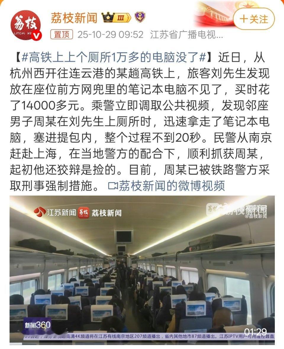 高铁上上个厕所1万多的电脑没了这人也不动动脑筋,高铁上那么多人,摄像头也有,还偷