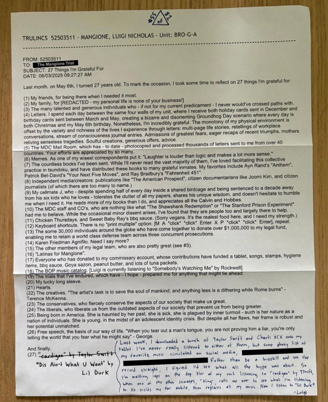 据报道,在一封经TMZ核实的信件中,路易吉·曼吉奥内透露自己在狱中一直在听霉霉Taylor Swift和查理Charli xcx的歌。