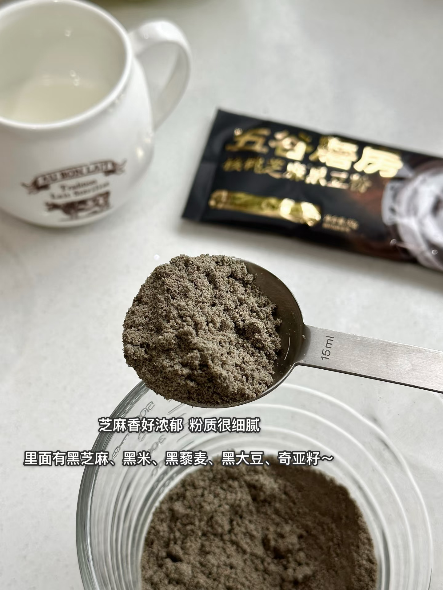 粉质很细腻,直接加热水就是浓郁的五黑芝麻糊