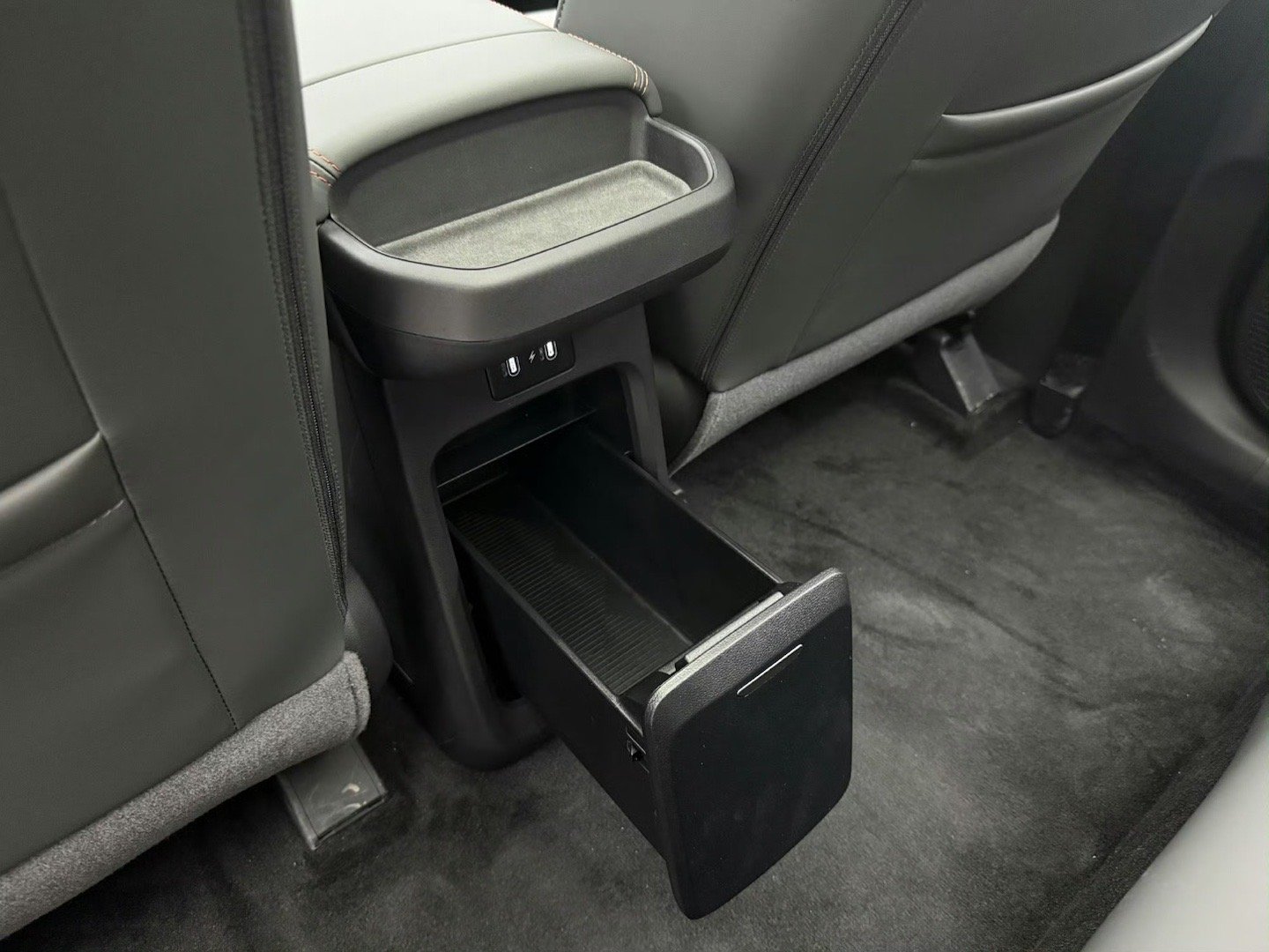 6、两个15W无线充电面板,支持双无线充电,这样主副驾驶不用再为1个充电位置争吵了,有助于家庭和谐。另外作为一款纯电车型,其方向盘后侧也设计了两个换挡拨片,其功能是切换 4挡动能回收。长按左拨片打开单踏板模式,长按右拨片切换自动模式;