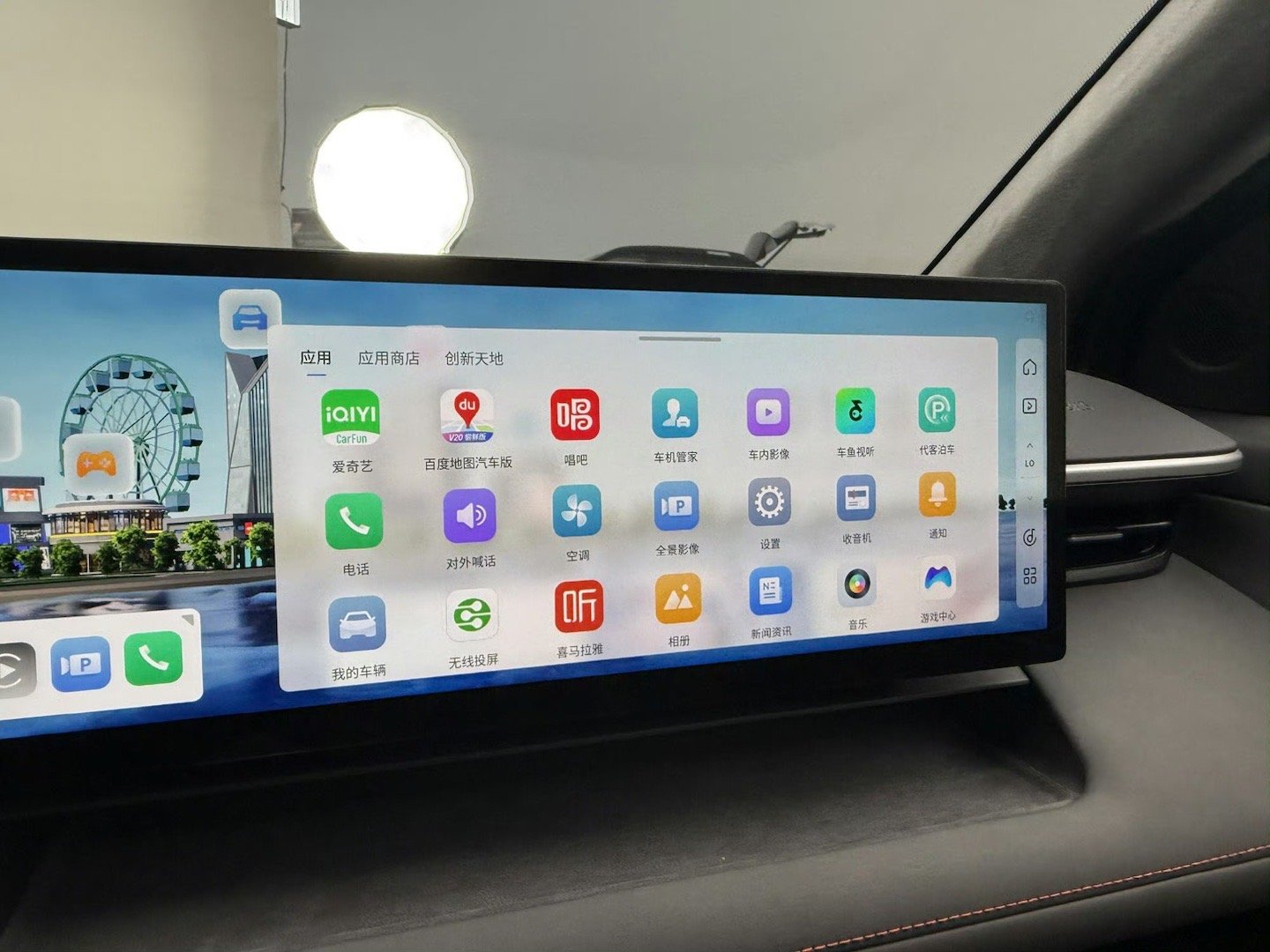 4、内饰的设计主打一个狂野,比如中控台上的这块27英寸大屏,视觉效果非常震撼,听说还是全系标配,这你服么。另外狂野的一点,这款车采用了一个叫“赛博之眼前景显示”的设计。将仪表信息投射至挡风玻璃下方,有普通、极简、地图三种模式;