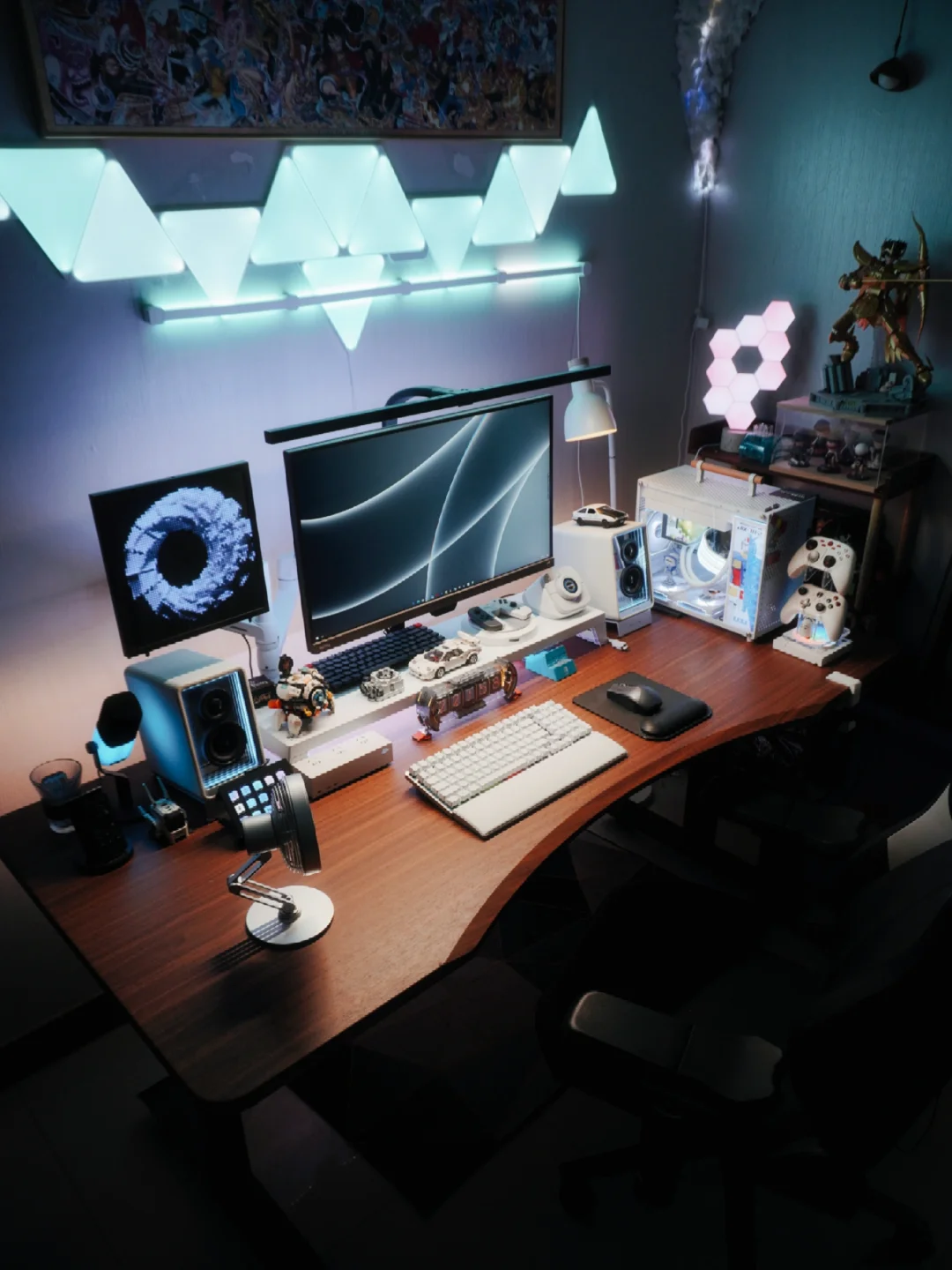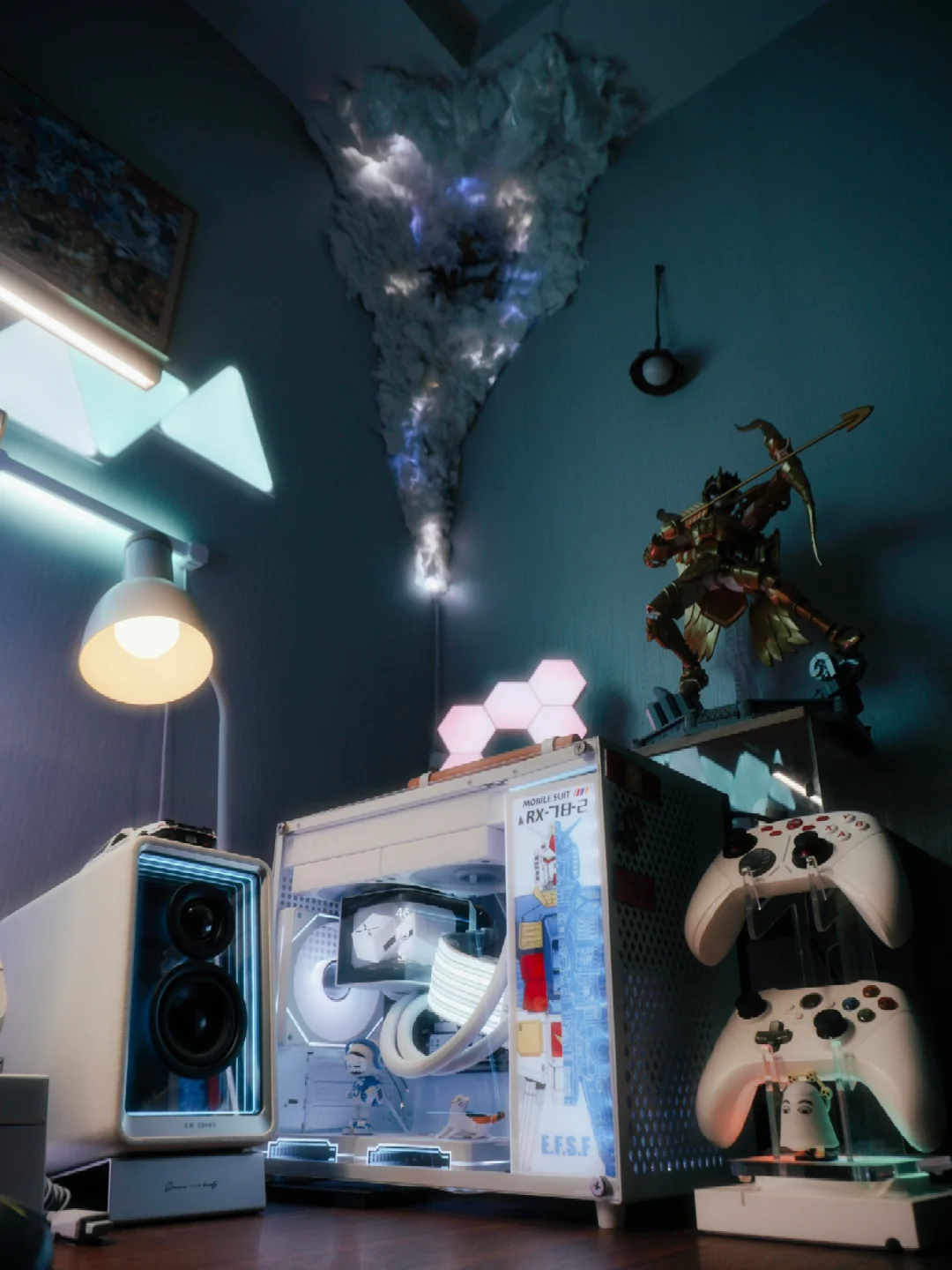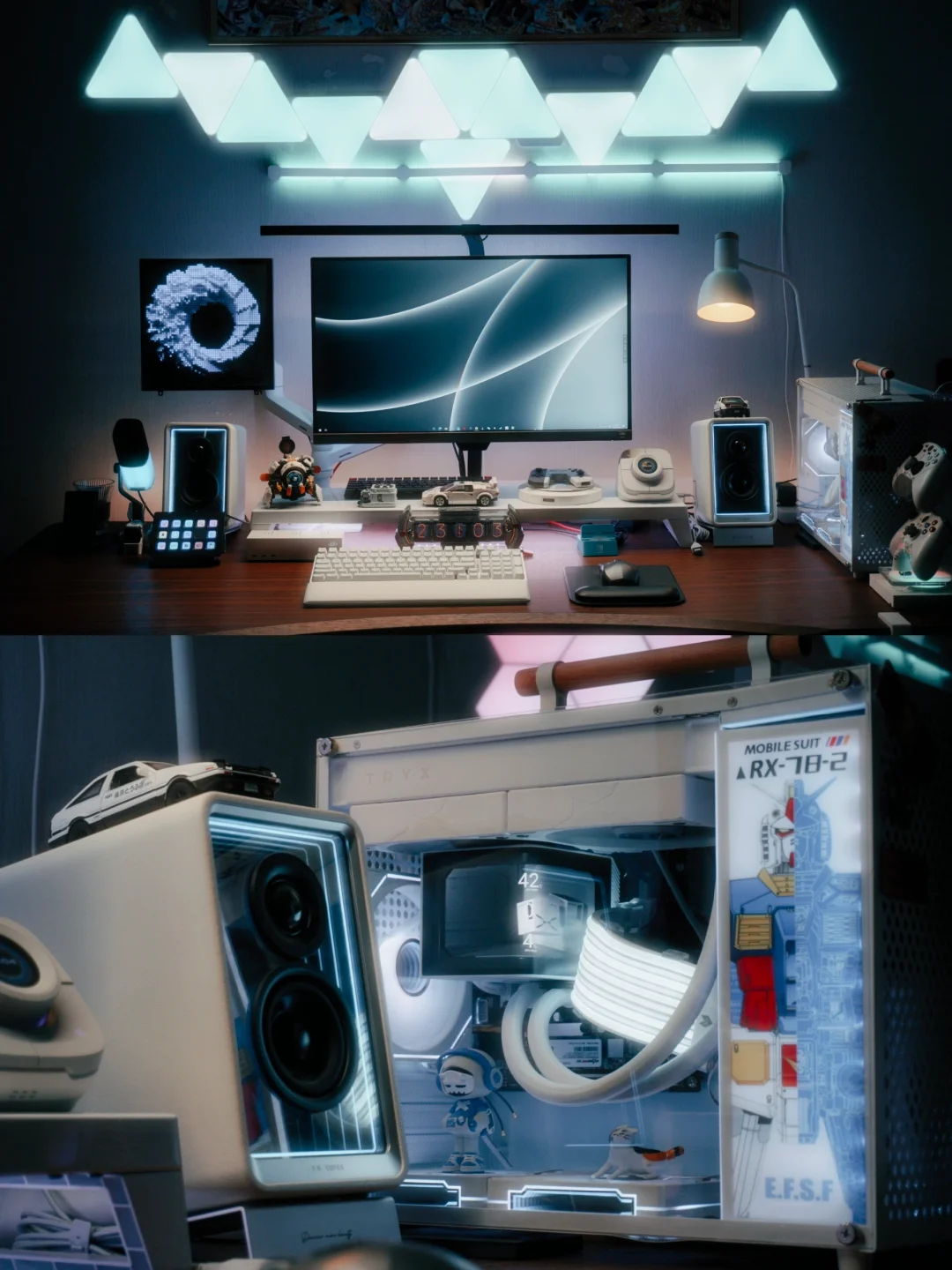 🖥️壁纸是Apple风格的,搭配白色的透明机箱主机,还有背景统一的青白灯光,还有音箱也是深渊镜的效果,整体搭配还是很有银翼内味;