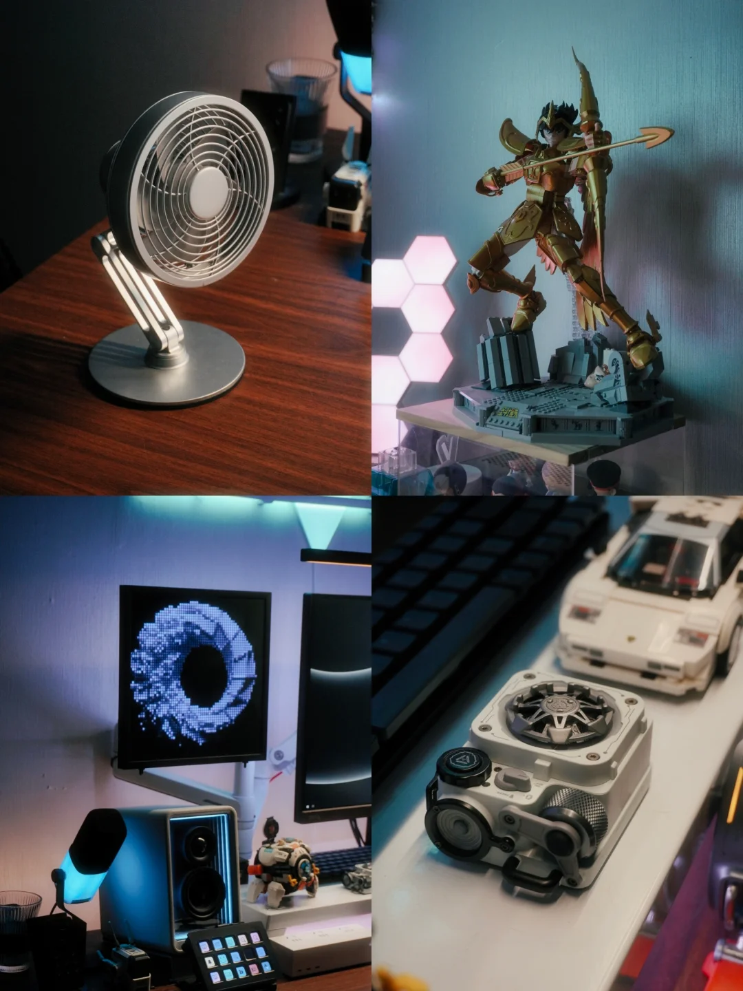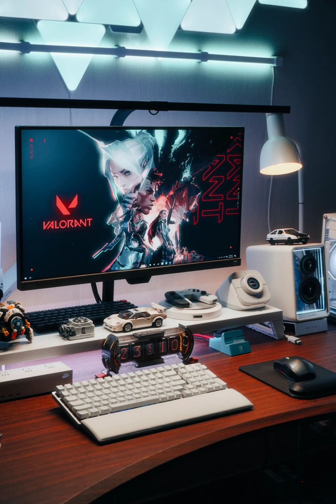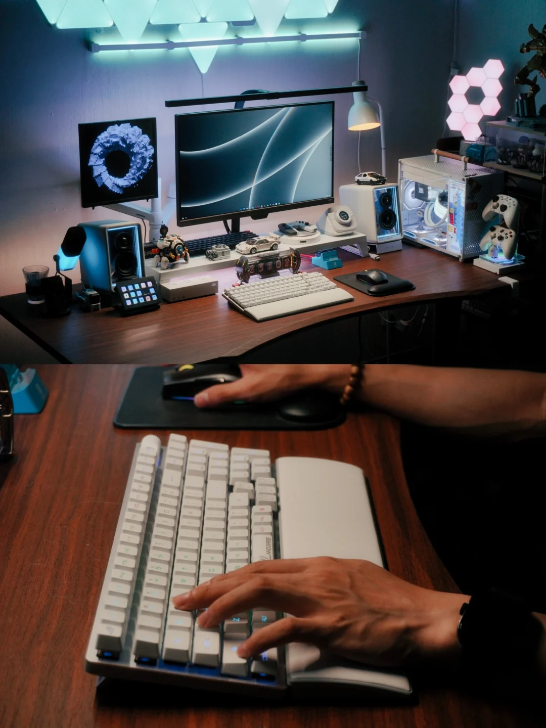🖥️壁纸是Apple风格的,搭配白色的透明机箱主机,还有背景统一的青白灯光,还有音箱也是深渊镜的效果,整体搭配还是很有银翼内味;