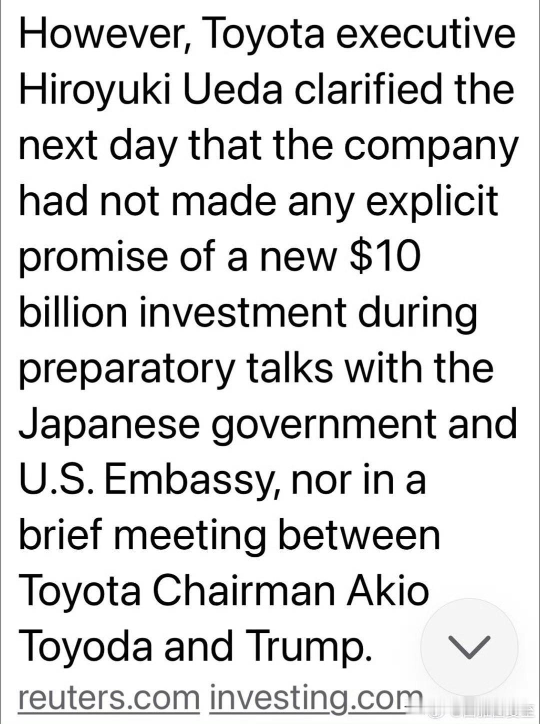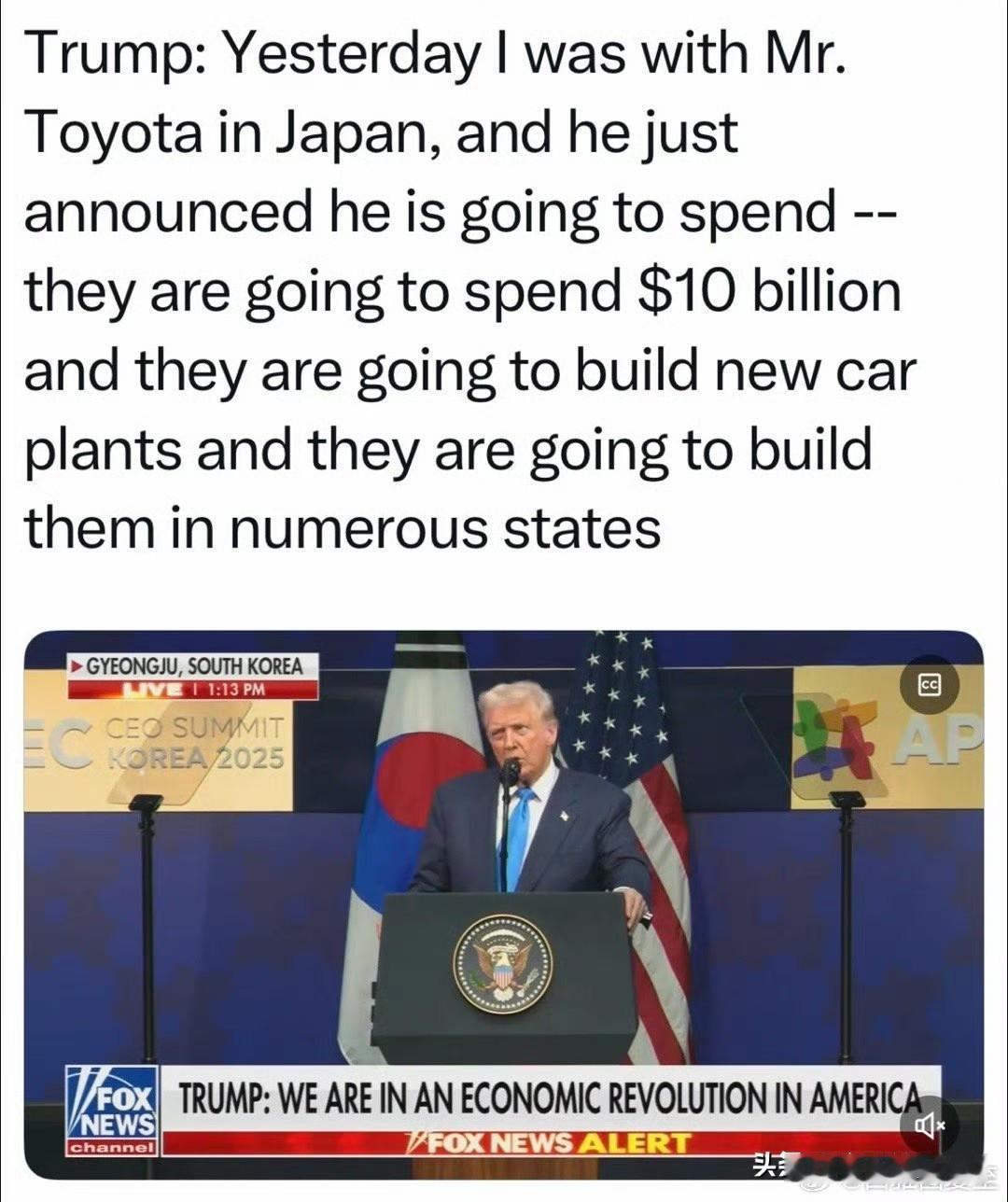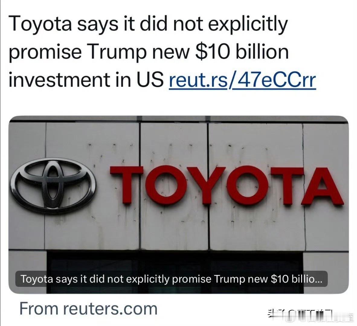 Trump在日本、韩国,都提到“刚听说/刚宣布,丰田承诺投资一百亿在美国建厂” 丰田投资100亿美元是真的,但不是从现在才开始投资,这项投资从拜登实施就开始了。 Toyota澄清:不是新投资或额外投资,是日美贸易谈判里“日方投资”的一部分,数月前已承诺,四年投资一百亿(Biden任期投了八十亿在北卡建厂) 这次特朗普访日,强调日本对美国的投资,不少于五千亿美元。其中就包括丰田的这笔投资。 这是一笔巨额投资,对日本来说不轻松,但特朗普施压,日本也不敢违背。所以把所有的的投资都算在里面,包括拜登时期的投资。如今都成了特朗普的功绩。 其实就是以关税换投资。日本虽然关税是15%,但与韩国不同的是,日本投资不能分摊到多年,项目由美国决定,利润90%归美国 。