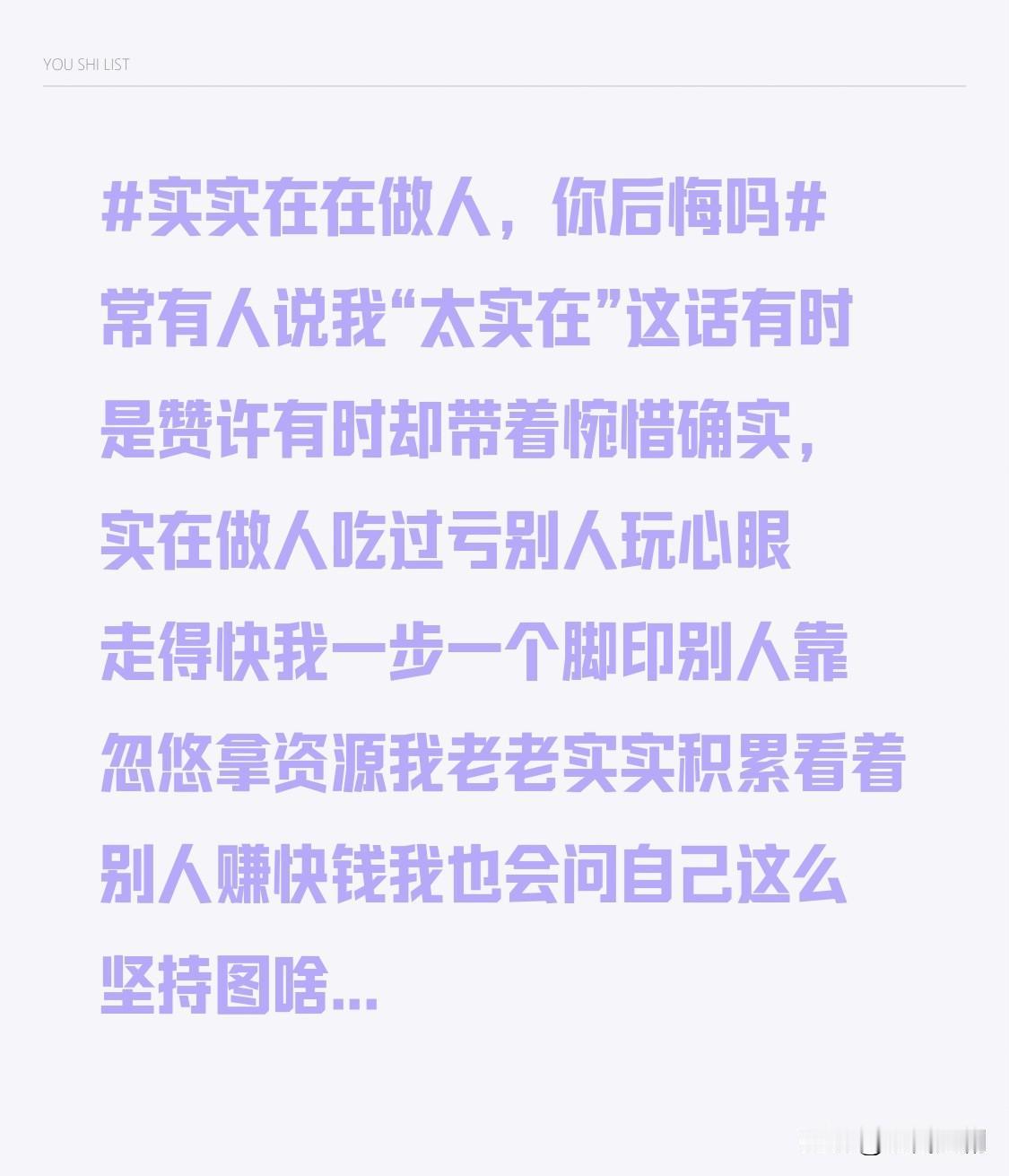 常有人说我“太实在” 这话有时是赞许 有时却带着惋惜 确实,实在做人吃过亏 别人玩心眼走得快 我一步一个脚印 别人靠忽悠拿资源 我老老实实积累 看着别人赚快钱 我也会问自己 这么坚持图啥 但我从不后悔 实实在在做人 内心安宁 无需为谎言提心吊胆 还能赢得真正的信任与尊重 建立可持续的关系 短期看 精明人易获胜 可长期 靠谱的人才能走远 靠实在积累的口碑和能力 才是谁也抢不走的财富 这个世界渴望“靠谱” 我依然会选择做实在人