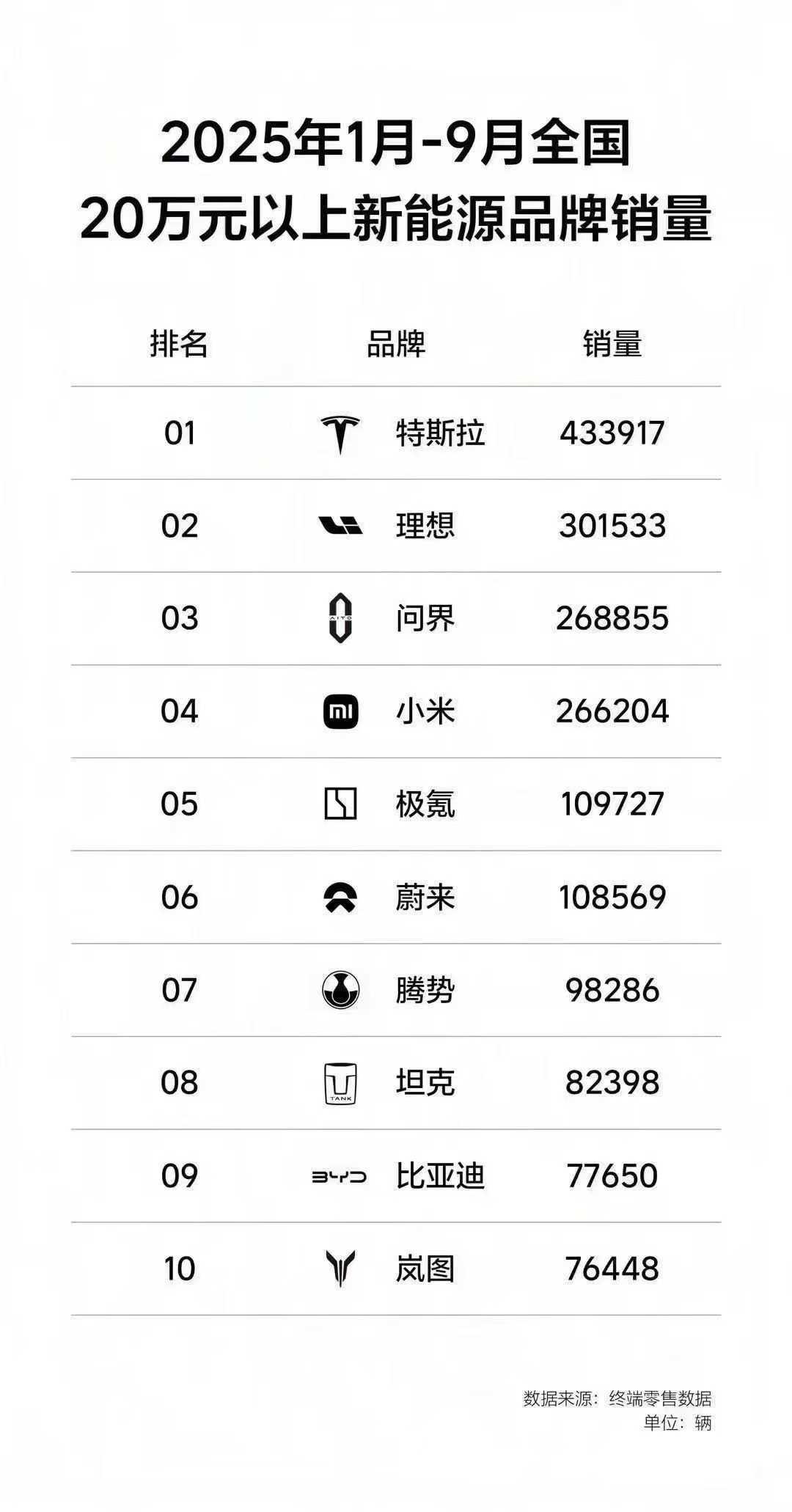 1-9月销量,20万元以上新能源品牌帮榜by理想汽车【来自懂车帝车友圈】