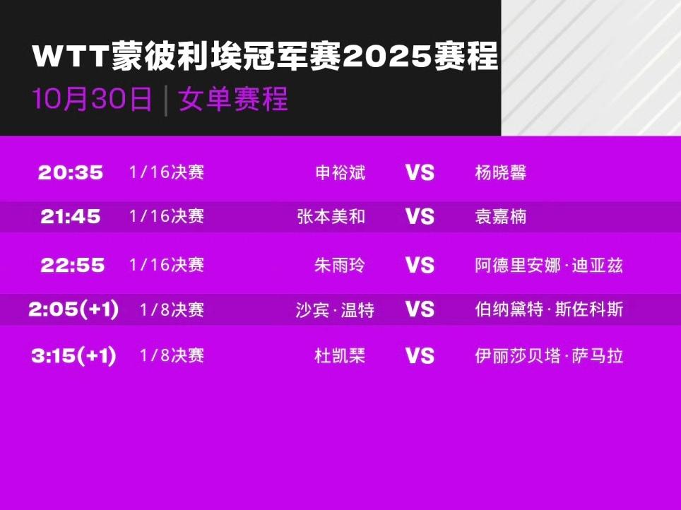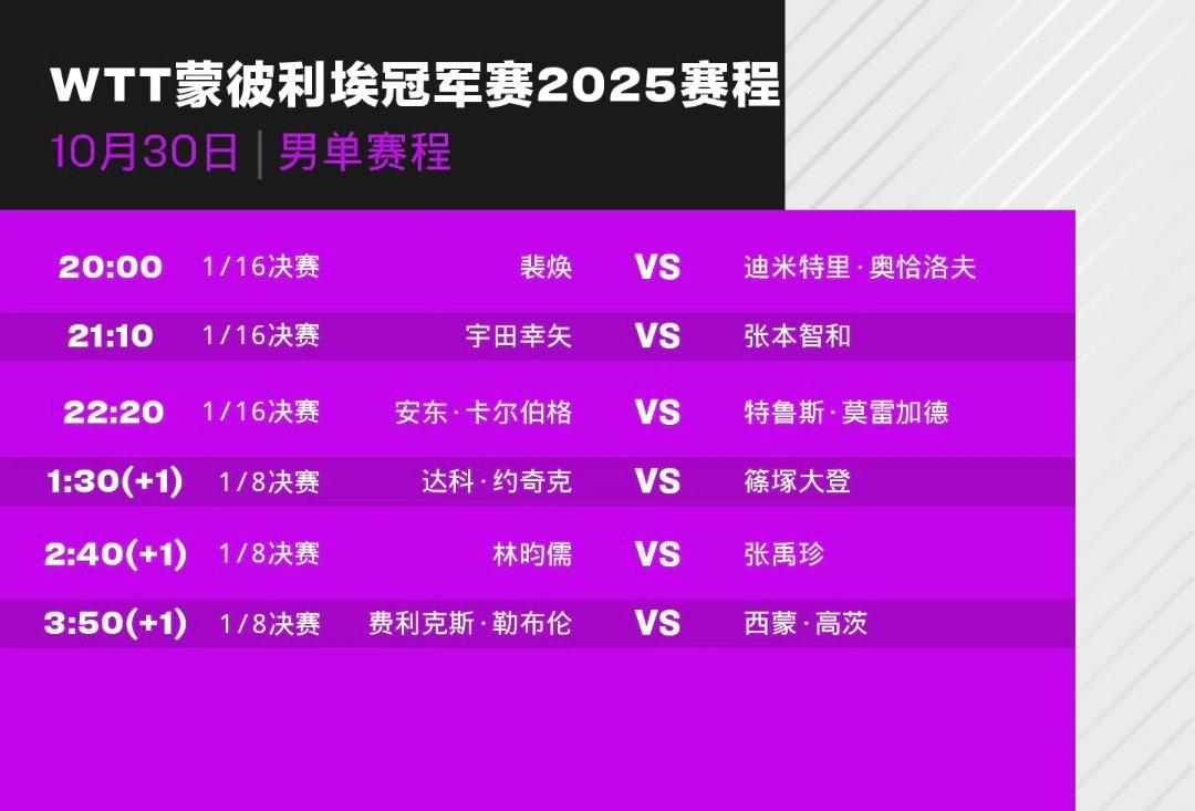 10月30日赛程! 蒙彼利埃冠军赛 正如火如荼进行中,首轮比赛尚未结束,今天进行首轮剩余比赛,之后将开始八分之一决赛! 今日赛程: 1️⃣男单首轮 20:00 奥恰洛夫vs裴焕 21:10 张本智和vs宇田幸矢 22:20 莫雷高德vs卡尔伯格 2️⃣女单首轮 20:35 申裕斌vs杨晓欣 21:45 张本美和vs袁嘉楠 22:55 朱雨玲vs迪亚兹 3️⃣女单1/8决赛 2:05 斯佐科斯vs温特 3:15 杜凯琹vs萨玛拉 4️⃣男单1/8决赛 1:30 达科vs筱塚大登 2:40 林昀儒vs张禹珍 3:50 菲利克斯.勒布伦vs西蒙高茨 首轮比赛国乒场次全部结束了,男单向鹏、陈垣宇、温瑞博三人全部出局,无人晋级到16强!女单头号种子陈幸同不敌斯佐科斯,二号种子蒯曼不敌金娜英,王艺迪战胜了早田希娜,陈熠战胜了张安!国乒参赛人员仅剩下女单两人了,继续加油,今天没有国乒比赛,期待明天!