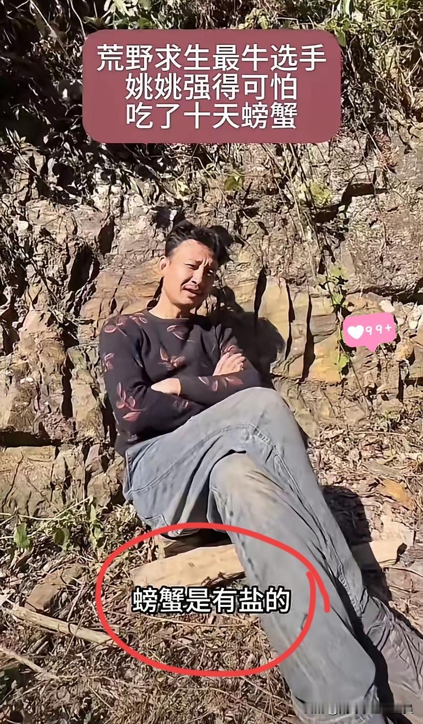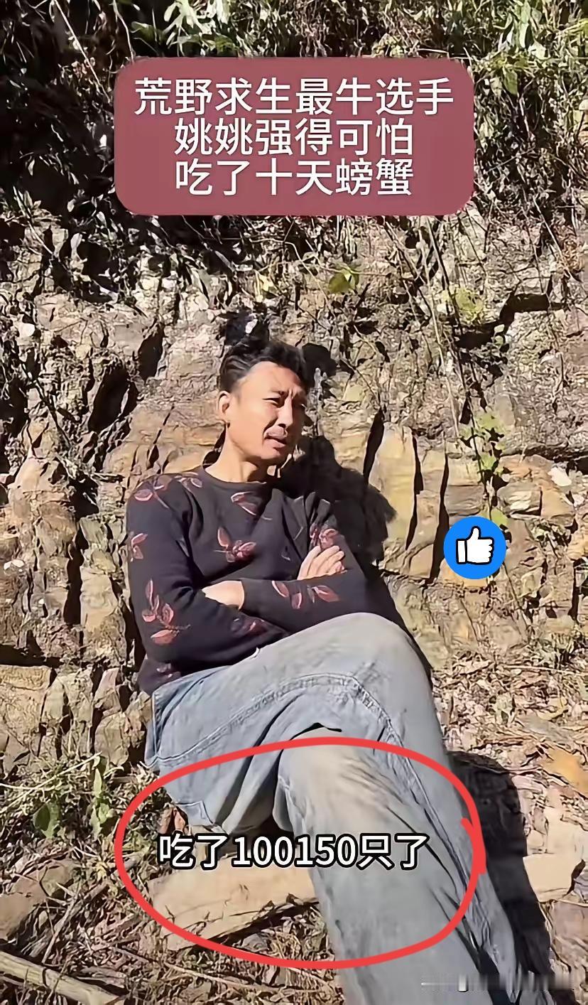 真得说荒野求生拼的不是体力是脑子!湖南通道杯那56号姚姚,10天啃100多只螃蟹,庇护所堆成小山的蟹壳全是“生存勋章”,这操作直接甩其他选手几条街。 别人还在愁去哪找盐,姚姚早把螃蟹摸透了——这玩意儿自带盐分,刚好补身体流失的电解质,简直是野外天然“盐罐子”。要知道缺盐容易抽筋乏力,他倒好,吃饱了晒晒太阳跟主播唠嗑,精神头比在家还足。