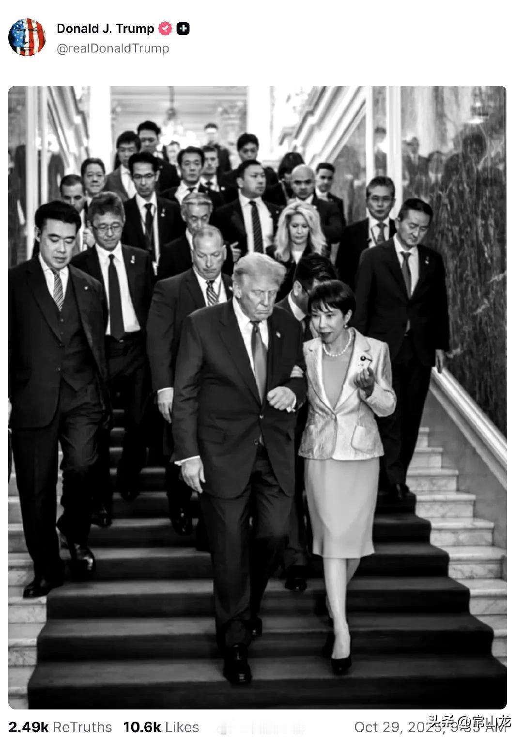 川普访日期间两张令日本网友炸锅的照片。 第1张是在日本举行的欢迎宴会上,川普和高市喝香槟碰杯时,川普举着高脚杯站着一动不动,只是肩膀微微前倾,手都不向前伸一下,高市由于个子矮小,加之又隔着宽敞的餐桌,够不到川普,只能俯下身子,前倾着尽力去跟川普碰杯。 第2张是川普还未离开日本前,发布在自己社交账号上的。 在一大群随从的簇拥下,高市挽着川普的手臂走下楼梯,边走边对着川普窃窃私语,表情极尽献媚讨好。 不晓得内情的,还以为是土豪KTV包场,妈妈桑正在给他介绍新货,哪里像是国与国之间的正常外交互动。 高市的献媚讨好,连日本网友都看不过去了,评论区骂声一片,觉得她像狗一样,丢了日本的“国格”。 不过,这种网友在日本国内毕竟只是少数,更多的日本国民觉得高市跟川普的互动就像“兄妹”交往,不仅不以为耻,反而沾沾自喜。 高市是日本极右翼势力选出来的,她以压倒性优势当选日本自民党总裁,成为日本首位女首相,她的当选,代表着日本主流民意,说明日本国内大多数民众,都是和她一样的想法。 早在1000多年前,老祖宗对日本的评价就一针见血。 《旧唐书·东夷·日本国传》:其人入朝者,多自矜大,不以实对,故中国疑焉。 其虚伪傲慢、自大又自卑的本性跃然纸上。