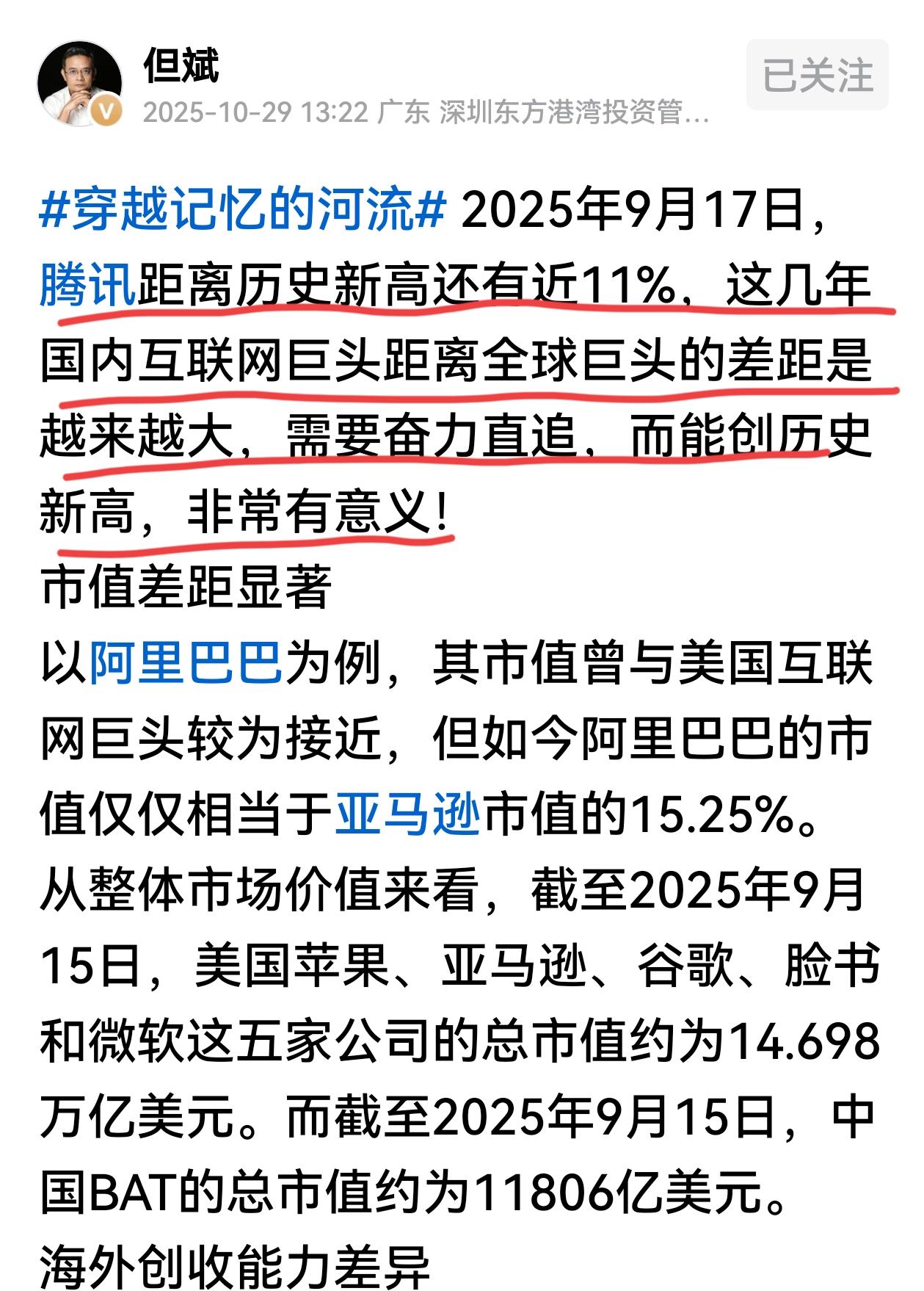 但斌的预测不虚,英伟达创造了历史,市值突破5万亿美元了,成为首家跨过这一里程碑的上市公司。 这是什么概念?超过了英、德、法等主要市场的市值,和印度市场的5.3万亿美元相当。我国A股10月27日的总市值是122万亿人民币,约17万亿美元,英伟达的市值近A股总市值的三分之一。 记得私募大佬但斌,在2024年5月的公开演讲中讲过,人工智能将有10年以上的增长周期,英伟达可能成为首个市值达10万亿的公司。2023年5月,英伟达市值是7500亿美元,2024年5月,英伟达市值到了2.7万亿,敢于预测10万亿确实需要功力。但英伟达市值这涨速确实快,从3万亿美元到4万亿美元耗时410天,从4万亿美元到5万亿美元耗时113天,这趋势涨下去,也许不需10年真的达到10万亿美元了。 不只是英伟达,美国其他科技大厂的市值也在快速增长。我们的科技大厂落后了,腾讯还没回到历史高点,阿里巴巴也被对手拉开了差距,但斌做了统计,2025年9月17日,中国BAT的总市值约为11806亿美元,他认为差距主要在海外创收能力和核心技术研发投入两个方面。 科技自立自强,一旦卡脖子问题得以解决,我国应该也会有市值5万亿美元级别的大厂吧,科技赛道值得期待。