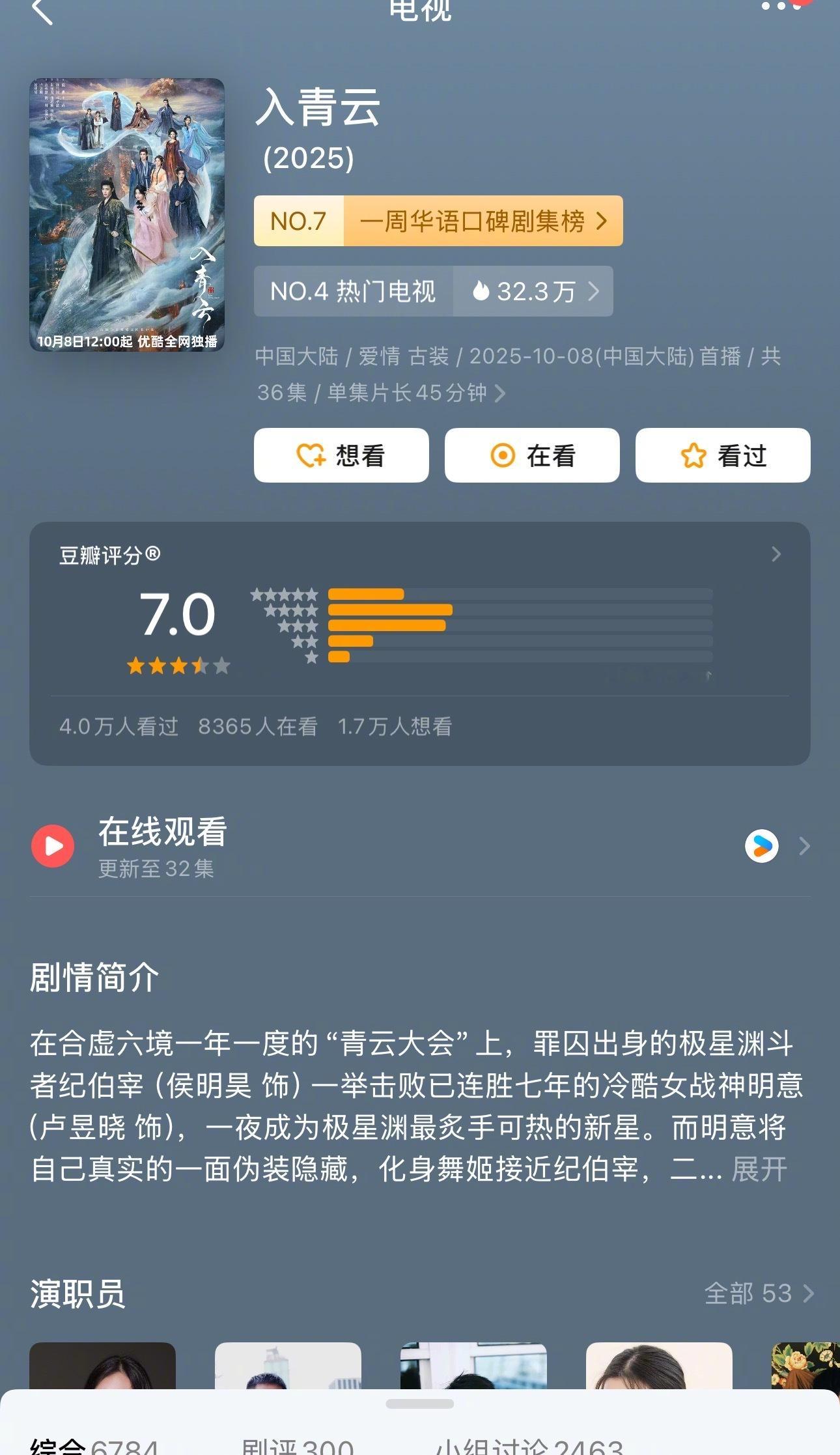刚看到侯明昊卢昱晓的《入青云》豆瓣评分7.0,这分严重被低估了,今年黑马剧[go
