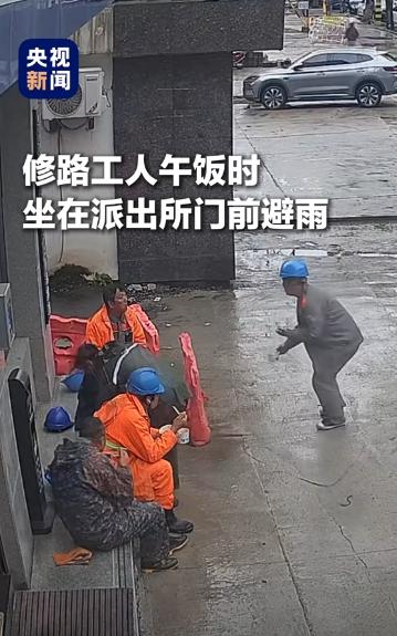 湖北一群修路工人午饭时,为了避雨,来到派出所门前台阶坐下,不料,民警发现后,竟然