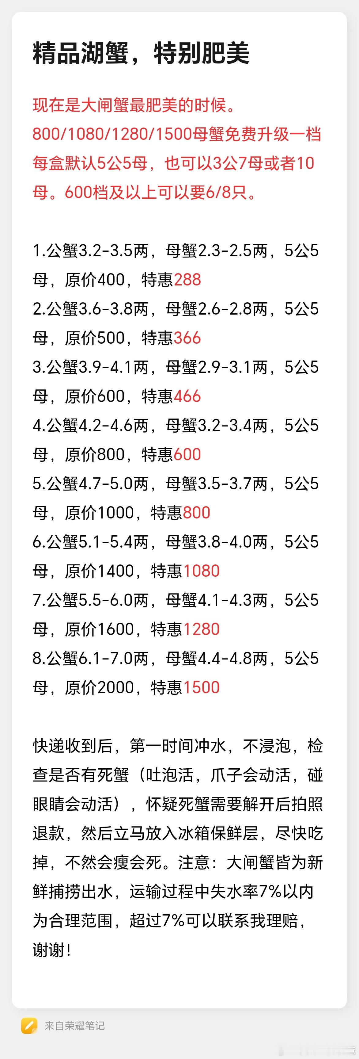 各位童鞋,精品湖蟹,母蟹10成肥,公蟹9.5成肥,现在最适合送礼了,800/1080/1280/1500档,母蟹还能免费升级,有需要的私信我,谢谢! ​​​
