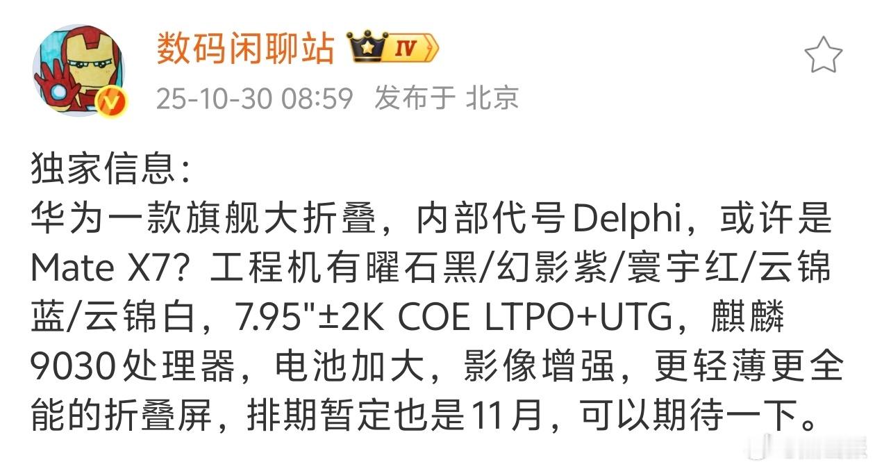 华为matex7大折叠配置曝光 这就来了?!站哥果然消息灵通!内部代号Delphi,或许是Mate X7?工程机有曜石黑/幻影紫/寰宇红/云锦蓝/云锦白,7.95"±2K COE LTPO+UTG,麒麟9030处理器,电池加大,影像增强,更轻薄更全能的折叠屏,排期暂定也是11月。