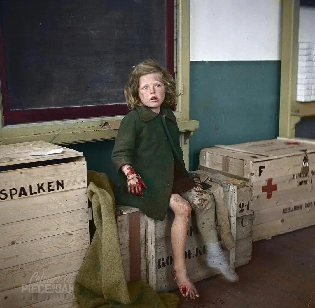 1945年5月初,荷兰格罗宁根省滕布尔,6岁的荷兰女孩贝齐·维林加在当地一所小学的红十字会救助站等待治疗。她身上的伤是在地窖中躲藏时被弹片击中导致,同时受伤的还有她的母亲和3岁的弟弟。