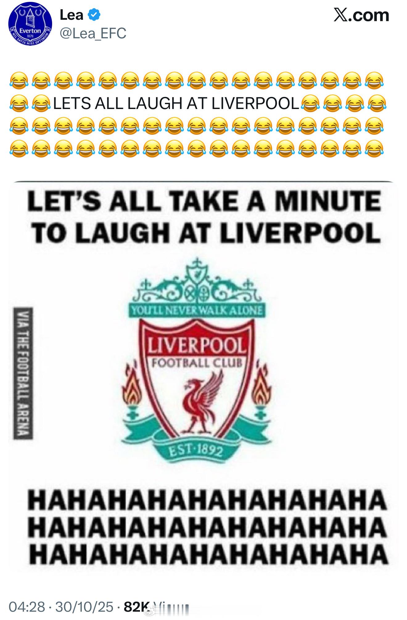 同城死敌埃弗顿嘲笑利物浦昨晚被水晶宫淘汰