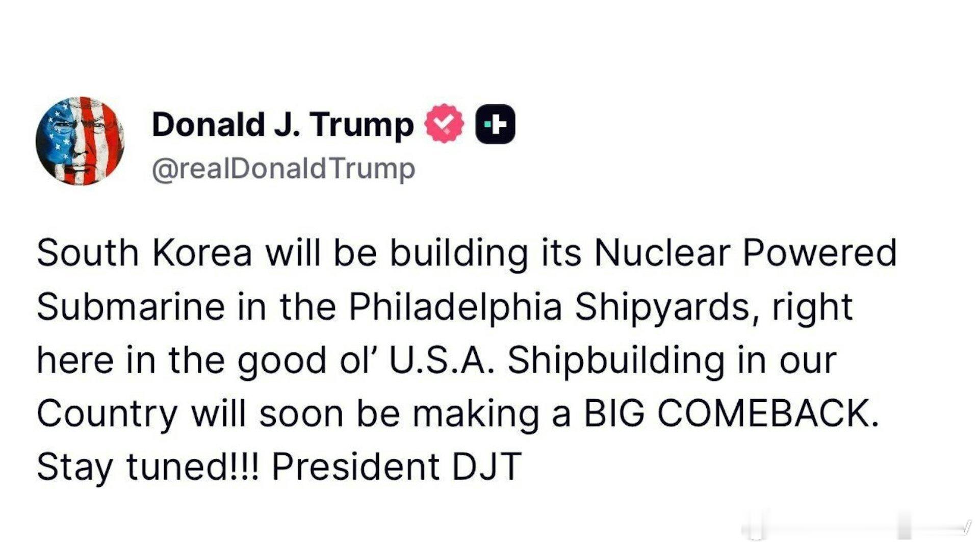 他连着又发一条贴文,称韩国将在美国费城造船厂建造这艘核动力潜艇,并说美国造船业“即将迎来强势复苏”。