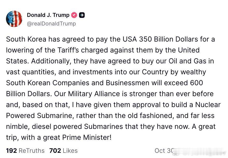 特朗普:“韩国已同意向美国支付3500亿美元,以换取美国降低对韩国征收的关税。他们将大量购买我们的石油和天然气,韩国富有企业和商人的投资将超过6000亿美元。我们的军事联盟比以往任何时候都更加牢固。基于这一点,我已经批准他们建造一艘核动力潜艇,而不是他们现在使用的那些老旧的、灵活性较差的柴油动力潜艇。”