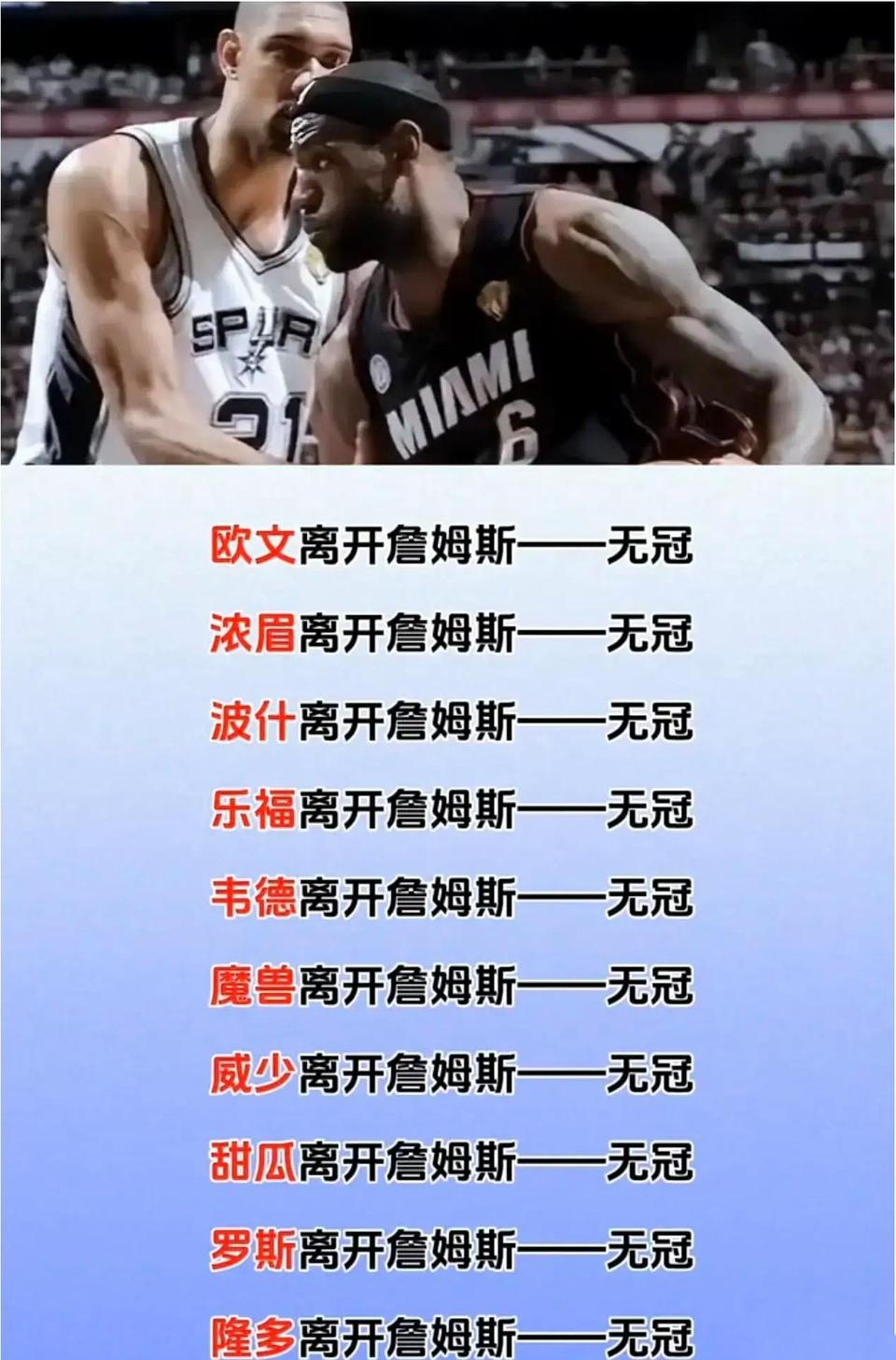 网络最新观点,他们离开詹姆斯都无冠。 韦德和隆多之前有冠军,跟詹姆斯合作又有冠军,离开詹姆斯时候老了也不可能有。 其他人离开詹姆斯,确实没冠军。 老詹去了三支球队夺冠,这就是证明。[大金牙]
