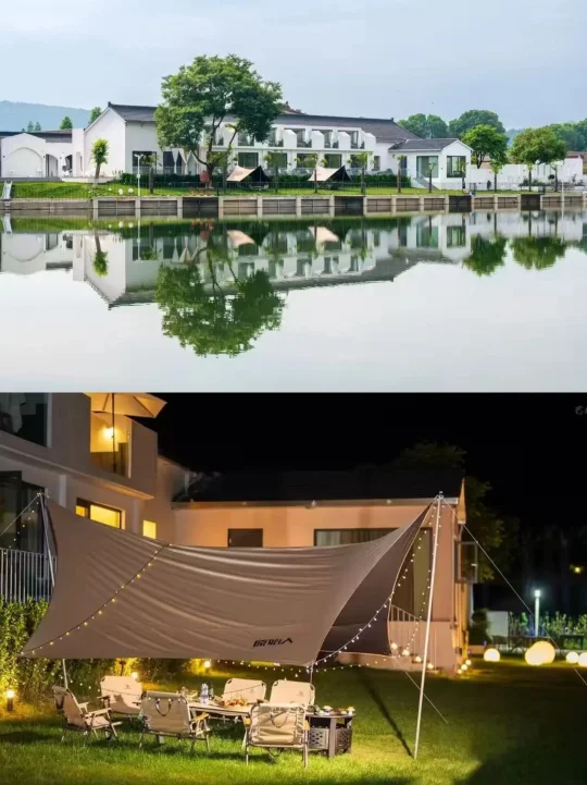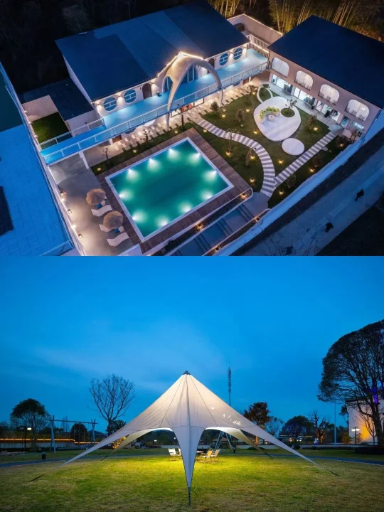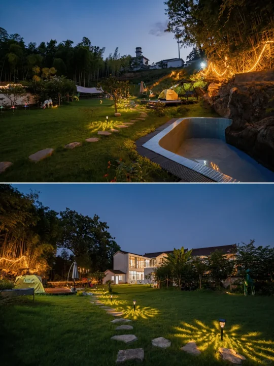 主打户外露营风,设帐篷住宿区、露天烧烤台与篝火场地