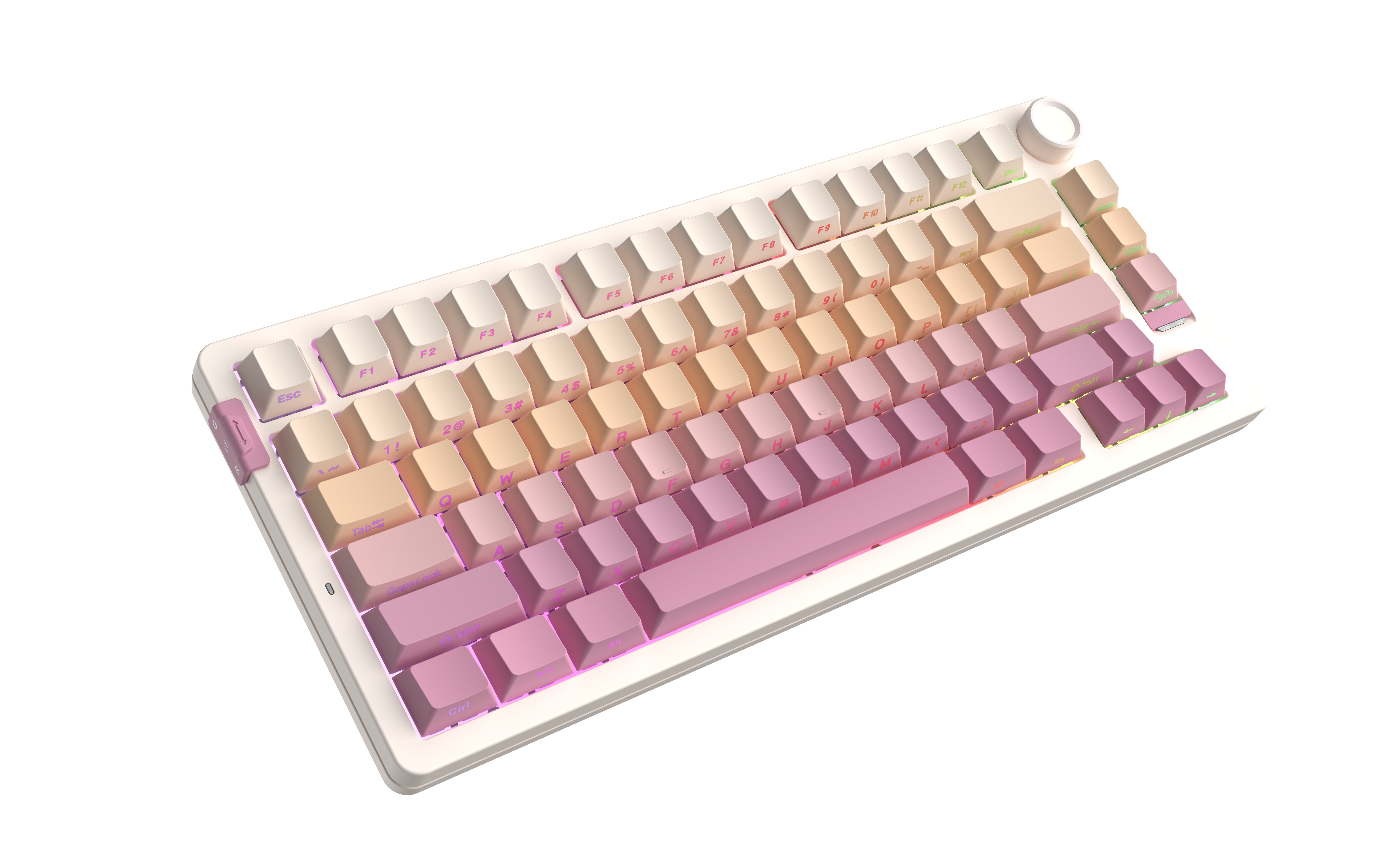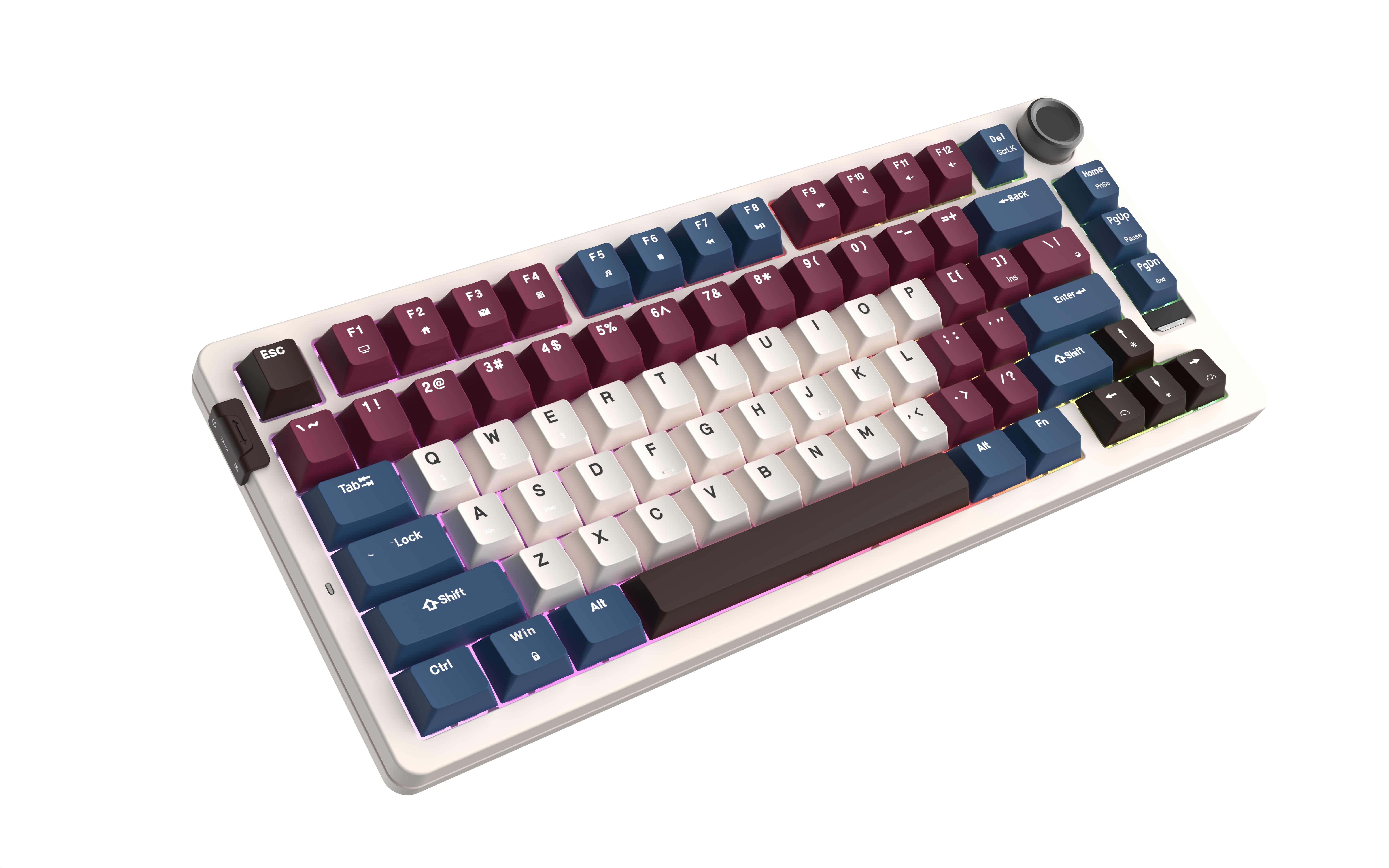 GASKET结构,带音频旋钮,75%配列,6000毫安时电池长续航(无线配对成功,全键盘背光调节关闭,持续不间断使用375小时左右,若灯最亮为48小时左右(电池充满状态)),低至2MS的无感延迟。支持MAC/WIN双模式。