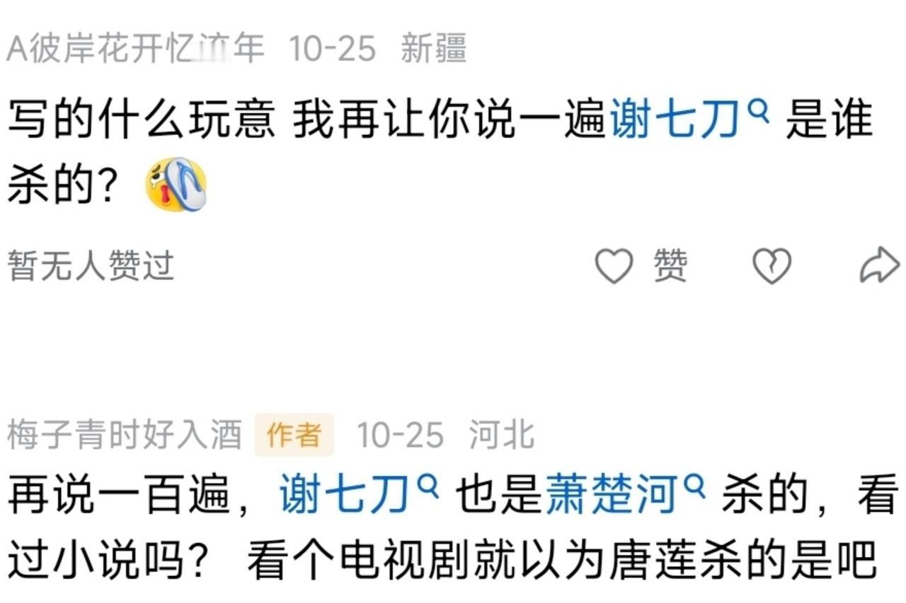 《少年歌行》中,谢家家主谢七刀到底是谁杀的?唐莲还是萧楚河? 谢七刀是谢家家主谢霸的师弟,在《暗河传》中苏昌河当大家长的暗河之乱时,谢七刀成为新的谢家家主,是三家家主之中唯一一个上一辈的人任家主。 到《少年歌行》时期,苏昌河带谢七刀、苏暮雨、唐门三老一起劫杀雪月剑仙李寒衣,谢七刀就在对战李寒衣、赵玉真时受了伤。 在伤还没好的情况,谢七刀、苏暮雨又是跟着苏昌河去了雷家堡,谢七刀再在雷门的雷遁阵下耗了不少力气,但依然压制唐莲和司空千落,两人围攻被打的战都都站不起来。 又有萧楚河以无极棍对战谢七刀,谢七刀虽败却以双拳凝聚五十年的修为重创萧楚河,而他收拳之后也是力竭而死。 这就是《少年歌行》原著中谢七刀的结局,是对战萧楚河时身死。 到了电视剧中,却给简单成了唐莲杀了谢七刀,完全不一样。 这个改动没什么说的,讨论也无所谓。 有些人就暴躁了,见说萧楚河杀的谢七刀,直接就是一通难听的话。 其实,电视剧也好,动漫也好,都跟小说不太一样,有时候你认为错的,实际原著小说就是这样的。 又比如《凡人修仙传》中的李化元,说他死于对战慕兰法士之时,就有说看过凡人吗,李化元分明是死于对战云露老祖时。 事实上,这是动漫和电视剧改动的,原著中李化元就是死于对战慕兰法士时,他都没有见过云露老魔,而且董萱儿也不是云露和红拂的女儿。 少年歌行