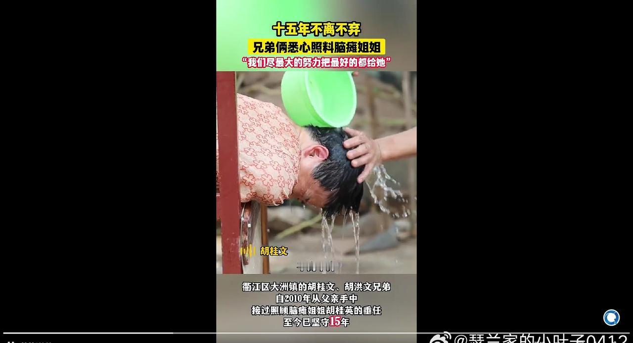 衢州兄弟俩十五年不离不弃悉心照顾脑瘫姐姐自2010年从父亲手中接过照顾脑瘫姐姐胡桂英的重担以来,兄弟俩商定以两个月为周期,轮流将姐姐接到家中悉心照料。