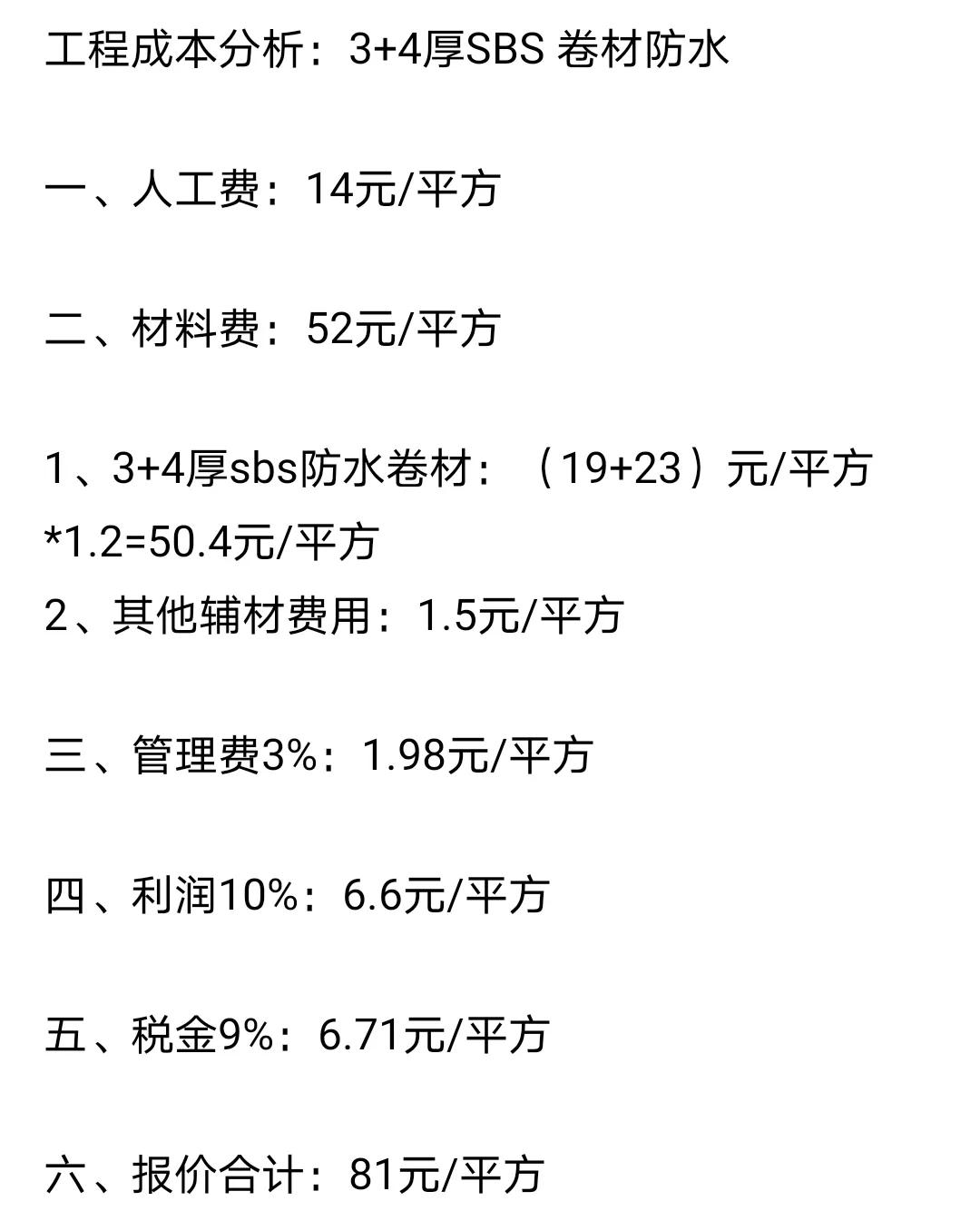 家人们,今天来给大家盘一盘3+4厚SBS卷材防水的工程成本,准备做防水工程的可要竖起耳朵听好啦! 先看人工费,每平方14元,这是工人师傅干活的辛苦钱。再说说材料费,每平方52元哦。这里面3+4厚的SBS防水卷材,(19+23)元/平方再乘以1.2,就是50.4元/平方,还有其他辅材费用每平方1.5元。 然后是管理费,占比3%,算下来每平方1.98元。利润呢,按10%算,每平方6.6元。最后还有税金,9%,每平方6.71元。把这些费用统统加起来,报价合计就是每平方81元。 我得跟大家说,这3+4厚SBS卷材防水工程,材料很关键,一定要选质量好的卷材,不然防水效果没保障,后期漏水可就麻烦了。施工的时候,师傅的手艺也得过关,铺贴要平整,不能有气泡、空鼓。还有啊,做完防水别忘了做闭水试验,时间一定要够,不然漏了都不知道,到时候返工可就亏大了。大家做防水工程的时候,这些都要注意,可别掉以轻心哦!SBS卷材防水