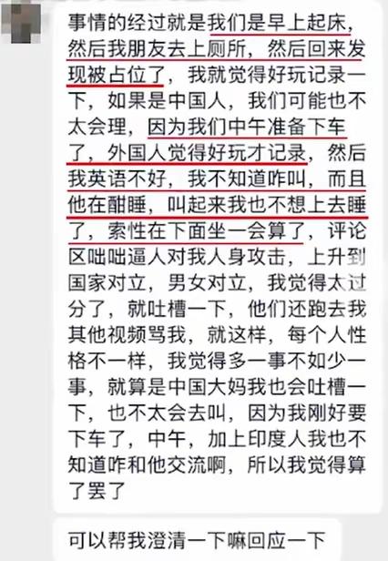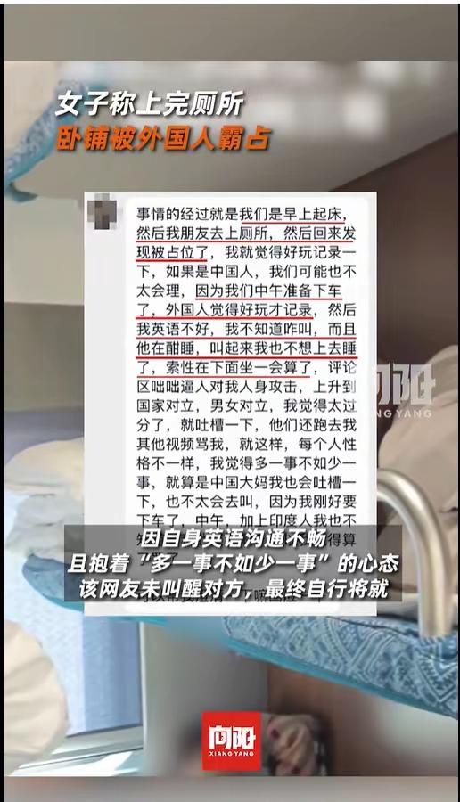 阿三哥的脸是不是有点大? 列车上,女子上了个厕所的工夫,回来就看到阿三哥躺在铺上呼呼大睡。女子因为一会就下车了,就没去叫醒他,坐在下铺。女子吐槽了一下,被网友怒骂。 这时候了,还管会不会英文?就用中文叫他下来,管他听不听得懂?如果不下来,就把列车员找来让他走。让他知道不能随便占别人的位子,不然还会有下次。 我们自己的合法权益就应该大胆维护。