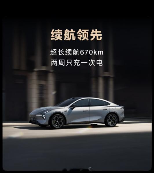 续航领先:纯电续航670km,两周只充一次电,支持5%电量零百加速仍进5.9秒。