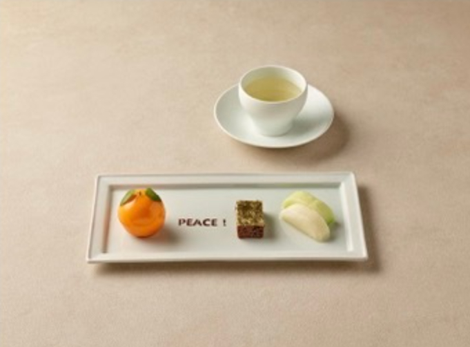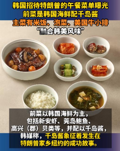 前菜是海鲜配千岛酱,主菜叫“诚意拼盘”,是用南棒子米饭、泡菜搭配美国牛小排(看着也没几块肉)[挖鼻],“和平缔造者甜点”,南棒子五味子汽水。如此用心的菜名,这顿饭显然是在讨好两个干爹,但是份量未免也太少了。