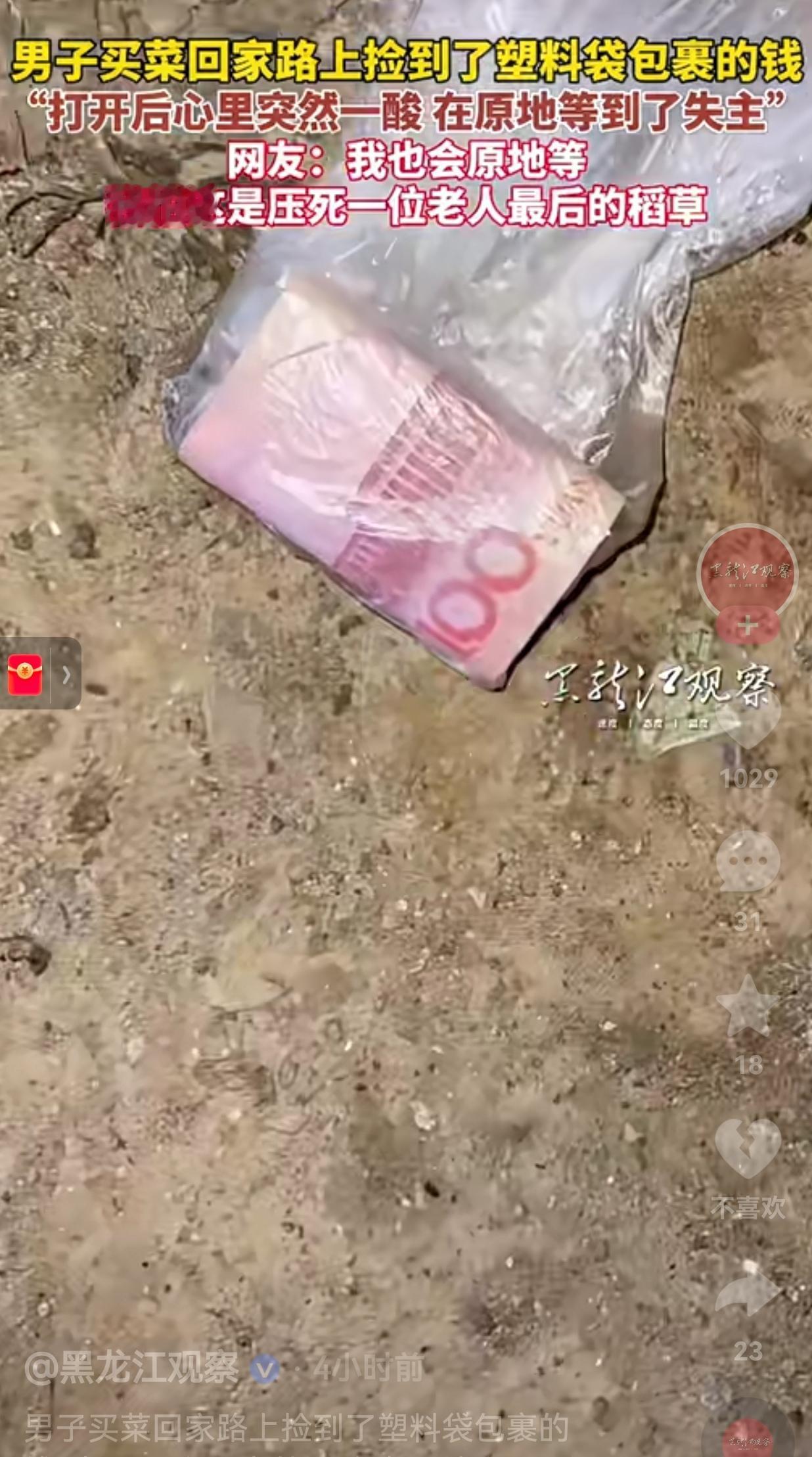 太暖心了!一男子买菜回家的路上,看到路边有失主丢失的钱财,仔细一看,这是用塑料袋包裹的钱。 男子捡了起来,并打开了里面的钱,数了数,也就一百多块钱,里面除了一张一百元的纸币,其他的都是零钱,最小的面额竟然是1毛。 男子看到失主包裹的这么认真,想必这些钱肯定对失主来说,一定很重要。 男子看到这些钱,突然鼻子一酸也不好意思占为己有,没有选择离开。而是静静地待在原地,最后,很幸运的是,终于等到了失主。 失主是一位老人,老人看上去很可怜。 男子庆幸很自己做了正确的选择男子说:“如果我真的拿了这笔钱,虽然没有人发现,但是良心肯定会受到谴责。因为这是老人辛辛苦苦挣得血汗钱,对于老人来说,一分钱都不容易,如果真的丢失了,肯定致命的打击。” 网友看到后评论说,如果换做是我,我也会原地等待,因为,通过钱包以及里面的钱,我就知道是老人丢失的。万一这笔钱是压死一位老人最后的稻草,那真的就罪过了! 还有的网友说,这钱可拿不得,拿了真的会折寿。 每个人都应该有这种理念,不是自己的钱,坚决不能要。不是自己的东西,坚决不能拿。虽说你可能很穷,也很需要这笔钱,但是,人穷志不能短。 大家觉得呢?欢迎大家评论区讨论留言。