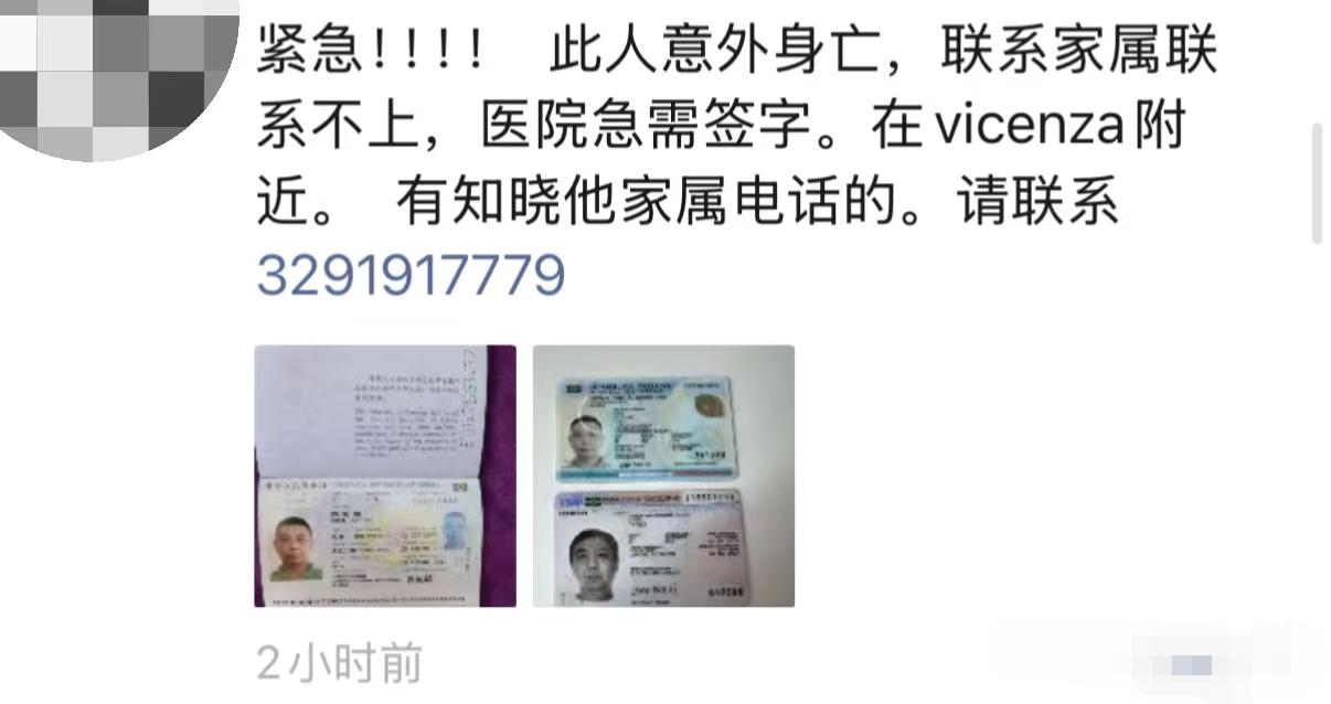 帮转!意大利华人去世,急寻家属! 陈挺毅,黑龙江人,1974年10月生,持有意大利居留卡,现在意大利维琴察附近。希望有认识他的人通知他的家人! [祈祷]