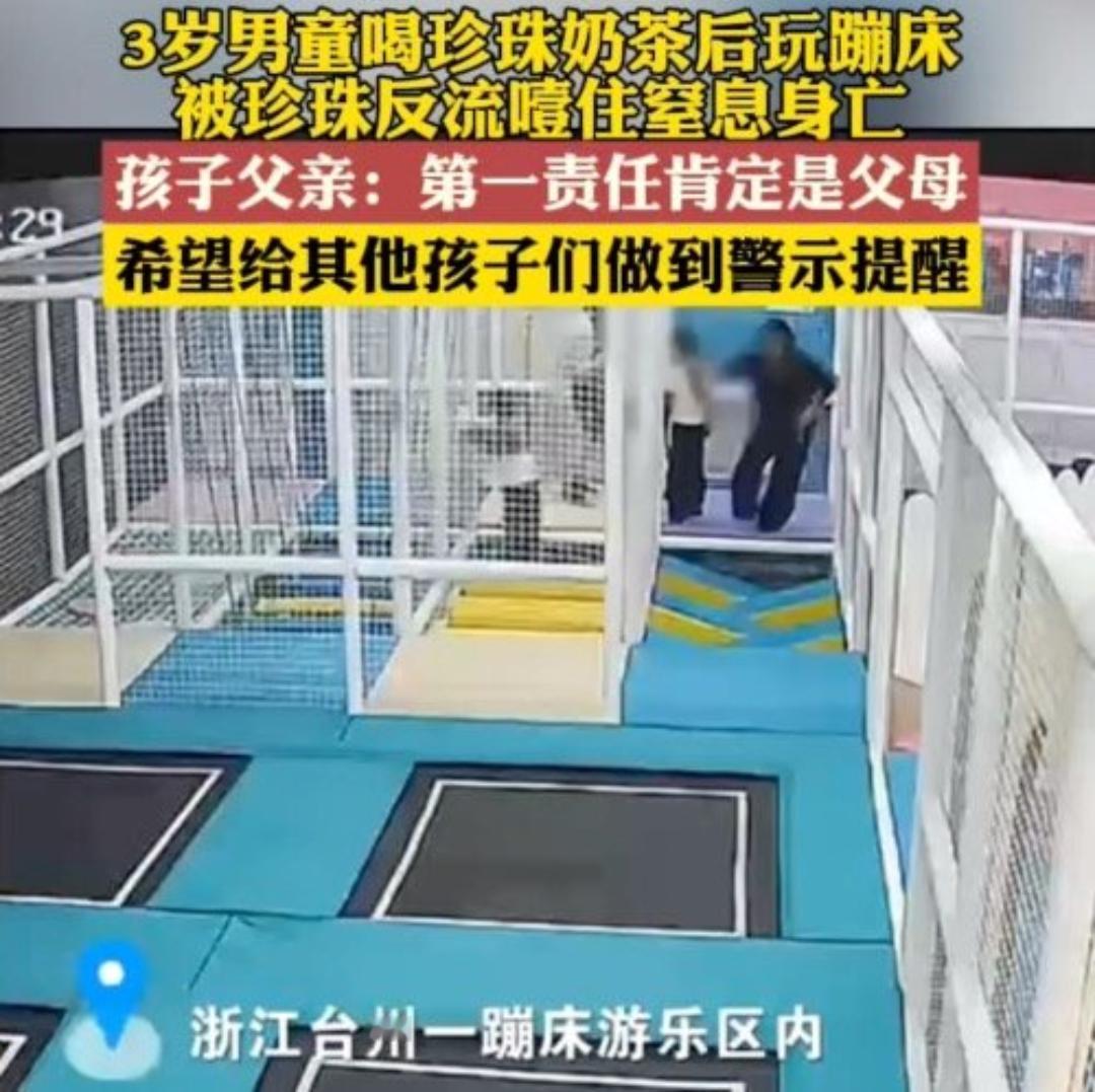 浙江台州有个3岁的男童,喝珍珠奶茶的时候去玩蹦床,结果窒息死亡了,这事儿真是让人痛心不已。孩子他爸站出来说话了,他觉得奶茶店的珍珠又大又黏,柜台那儿也没提醒喝奶茶有窒息风险。商场和游乐场呢,也没采取啥预防措施,他觉得各方都脱不了干系。 从现场监控能看到,孩子在蹦床上突然就出事儿了,前后就几十秒,实在太突然了。本来一家人周末开开心心去逛商场,谁能料到会发生这种事啊。不过网友们的看法不太一样,有人觉得小孩不该一边吃东西一边疯玩,喝完奶茶就去蹦床,这也不符合常理。 这起悲剧给咱们都提了个醒,带孩子的时候每一步都得小心谨慎,商家也得做好风险提醒。男童被噎身亡