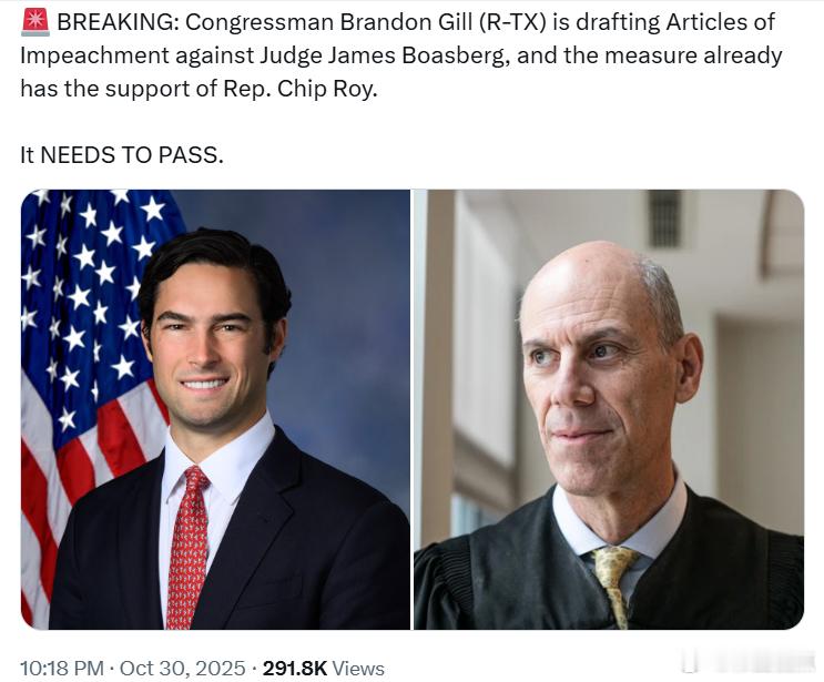 德州共和党众议员布兰登·吉尔正在起草对法官詹姆斯·博斯伯格的弹劾条款,这一提案已经得到了众议员奇普·罗伊的支持。