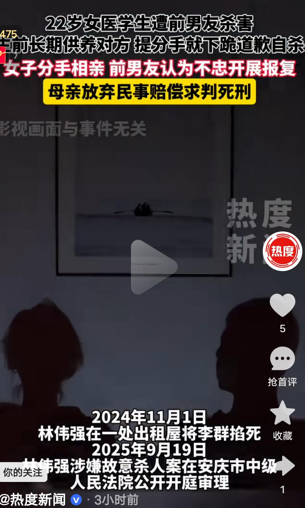 杀害22岁女医大学生的男子,真的太心胸狭隘了!就因为人家女方提出来分手,他就心生歹念,把人给活活掐死了。 这女大学生名叫李群,安徽安庆人。在2022年和男友林伟强确定的恋爱关系。 两人相处不久,李群就发现林伟强不能托付终身,因为林伟强没有固定工作,两年来一直都是李群养着。 期间,李群费尽心思给他找过好多工作,可林伟强都只是去干个两三天,就以各种借口,不再去了。 然而,当李群提出来分手,林伟强立刻痛哭流涕,又是磕头又是自杀的闹腾,说自己一定会痛改前非,可等事情过去,他还是一副不思进取的模样。 历经两年,对这段感情,李群感到太累了,在2024年正式和林伟强提出了分手。 刚开始,林伟强没说什么,他以为,过些日子,李群还会像以前一样原谅他。 然而,当看到李群结交了新男友时,他才意识到,这次,女朋友是真的不要他了。 顿时,一股歹意直冲天灵盖:“既然得不到,那就毁掉!” 打定主意,他在网上买来军刺和电击棒,打电话给李群,骗她说,想汇报一下网店经营情况,让她快点过来。 李群哪里想到,曾经的甜蜜男友,早已变成了魔鬼,就去出租屋找他。 然而,刚进屋,林伟强便直接伸出手,活生生掐死了她。 事后,为摆脱嫌疑,林伟强先把空调下调到16度左右,延迟尸体腐烂,又把李群的手机拿走,删除了所有的通话记录。 但纵使狡兔三窟,也难逃猎人的法眼。很快,林伟强就被捕了。 真为李群感到不值,才22岁,正是人生中的大好年华,就因为遇人不淑,便香消玉殒了。 这给那些准备交男女朋友的人提了个醒,遇到那些特别偏激的人,早早抽身,才是上策。