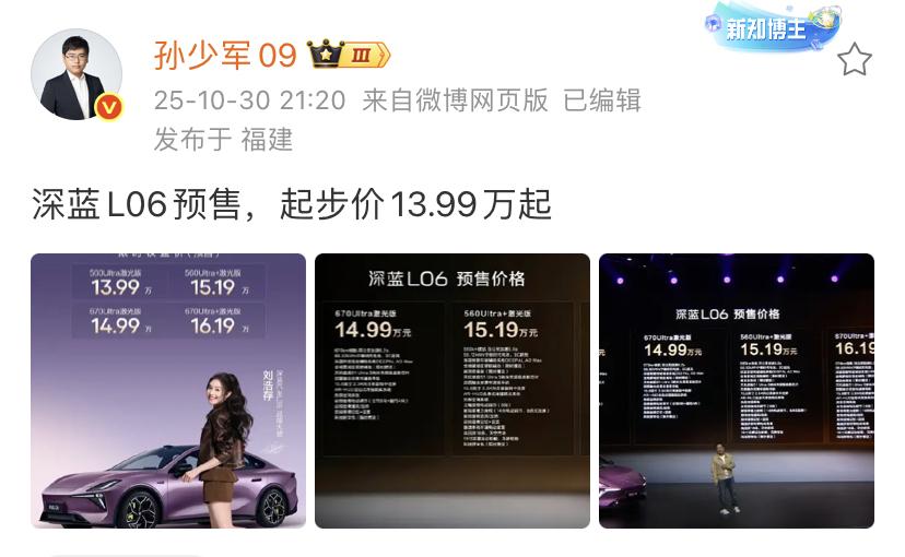 孙少军:深蓝L06预售,起步价13.99万起! 需要着重介绍的,即使是最入门的车型也是有激光雷达的,所以如果对辅助驾驶有一定需求的人这款车应该是不能错过的。 按照国产车一贯的习惯,正式价格比现在公布的13.99万元还要优惠,这个价格应该来说还是比较值得。 各位是怎么看的?欢迎评论区留言。
