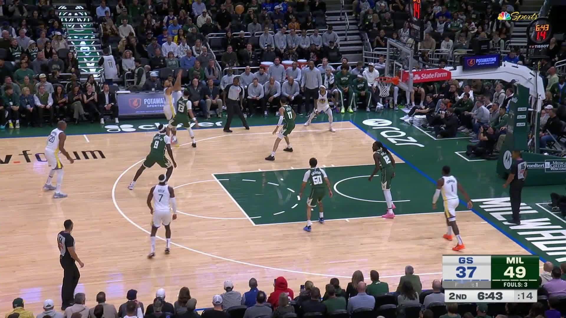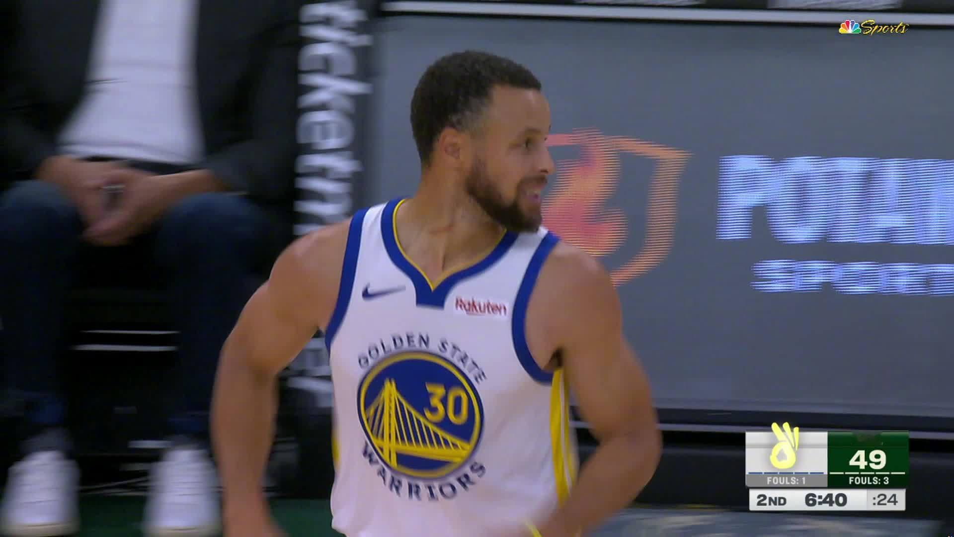 库里侧翼三分👌勇士40:49雄鹿。勇士vs雄鹿