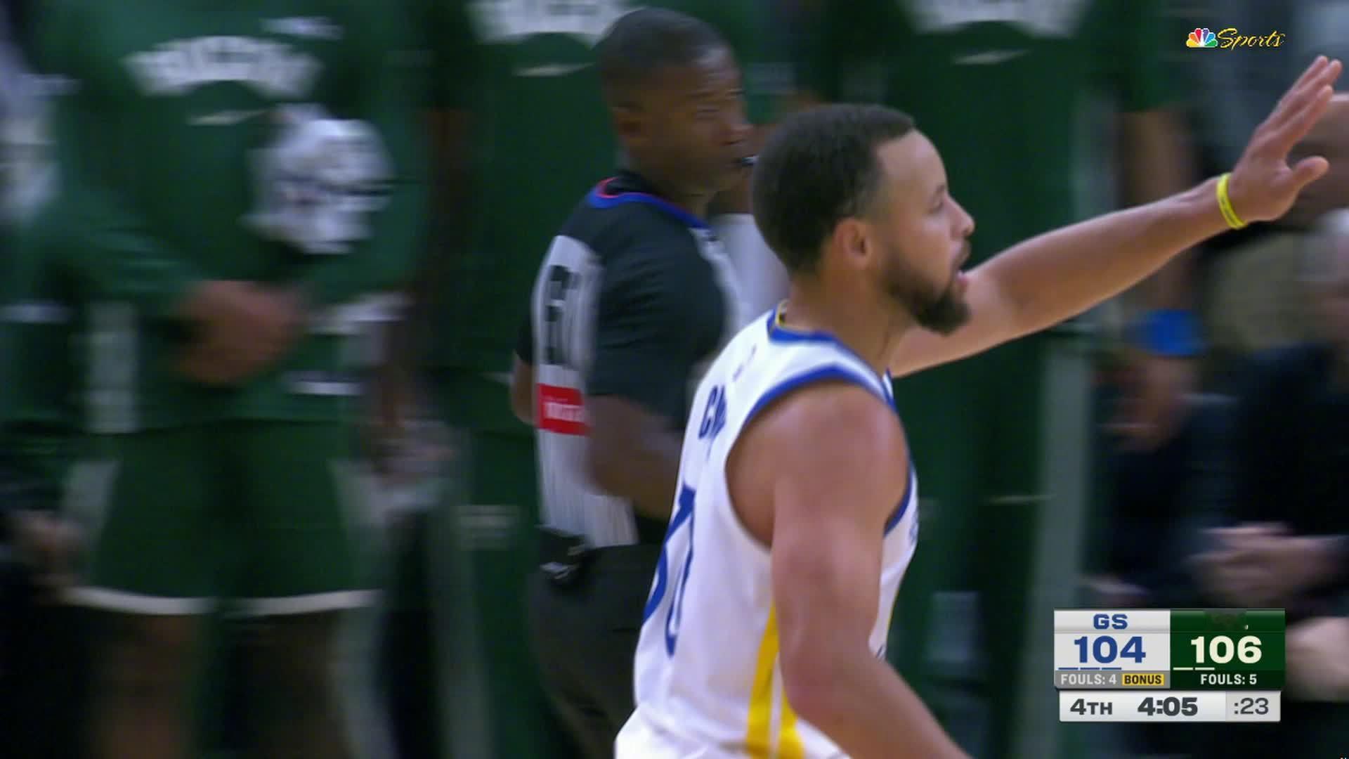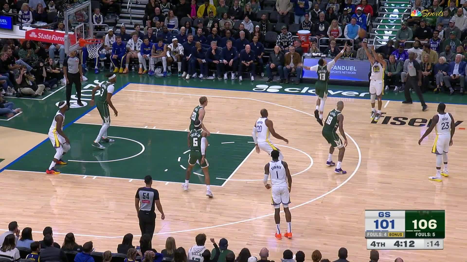 库里超远三分!!比赛还剩3分43秒,勇士104:109雄鹿。勇士vs雄鹿