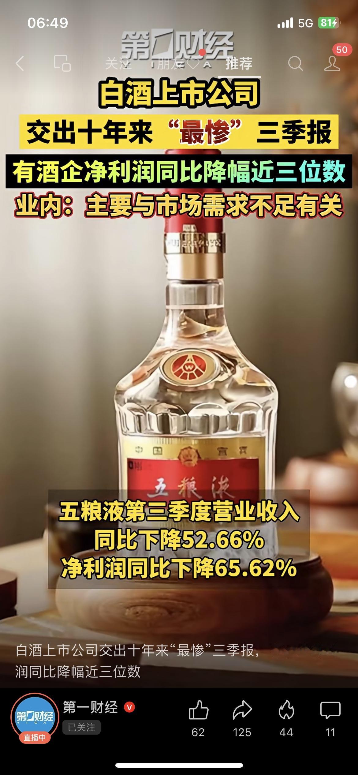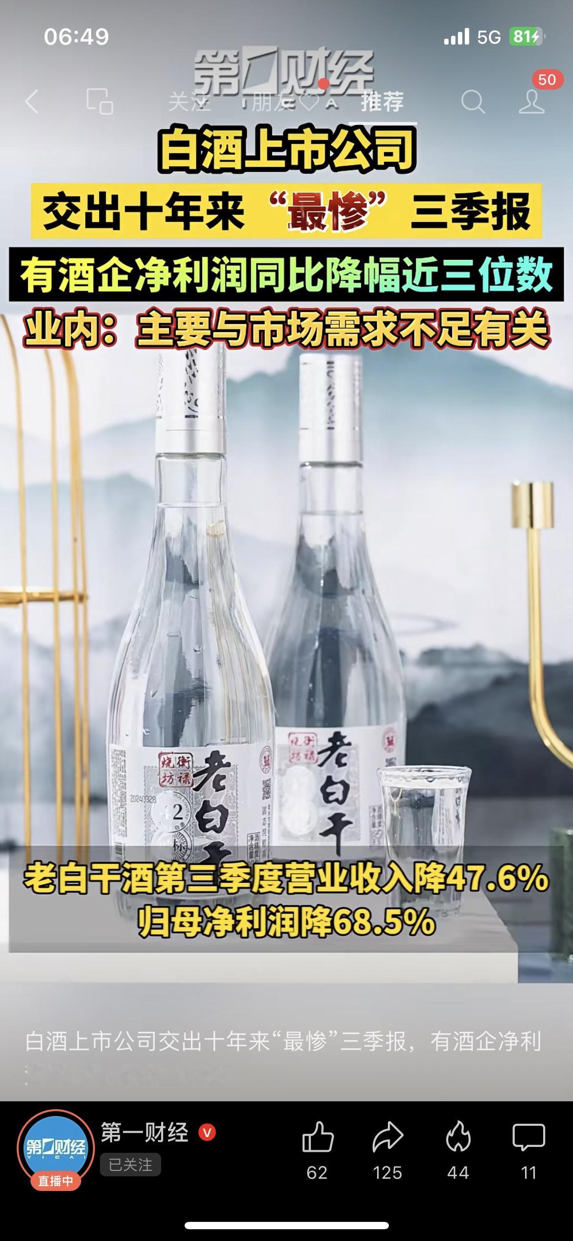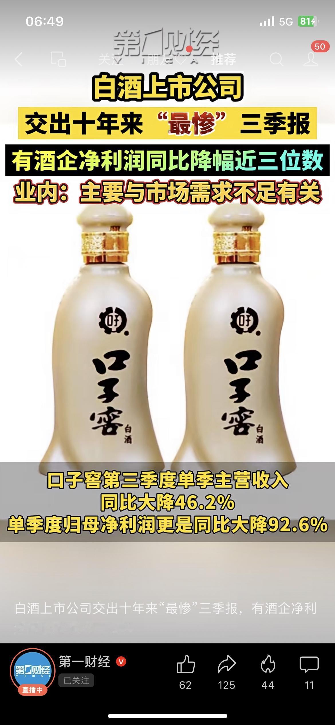 白酒崩了!巨头净利狂跌92% 白酒圈今天集体懵了!上市酒企交出“十年最惨三季报”,有的净利直接砍没了九成! 口子窖单季净利暴跌92%,连五粮液都跌了65%——这是现在的人都不爱喝白酒了? 你觉得这波是白酒要凉,还是只是暂时低迷? 家里囤了酒的,现在出手是不是亏大了?白酒行业分析 白酒业困局