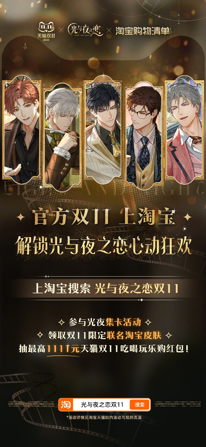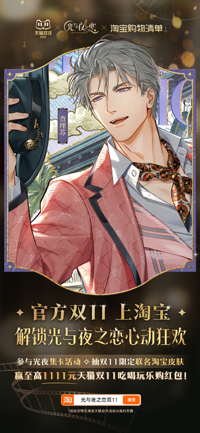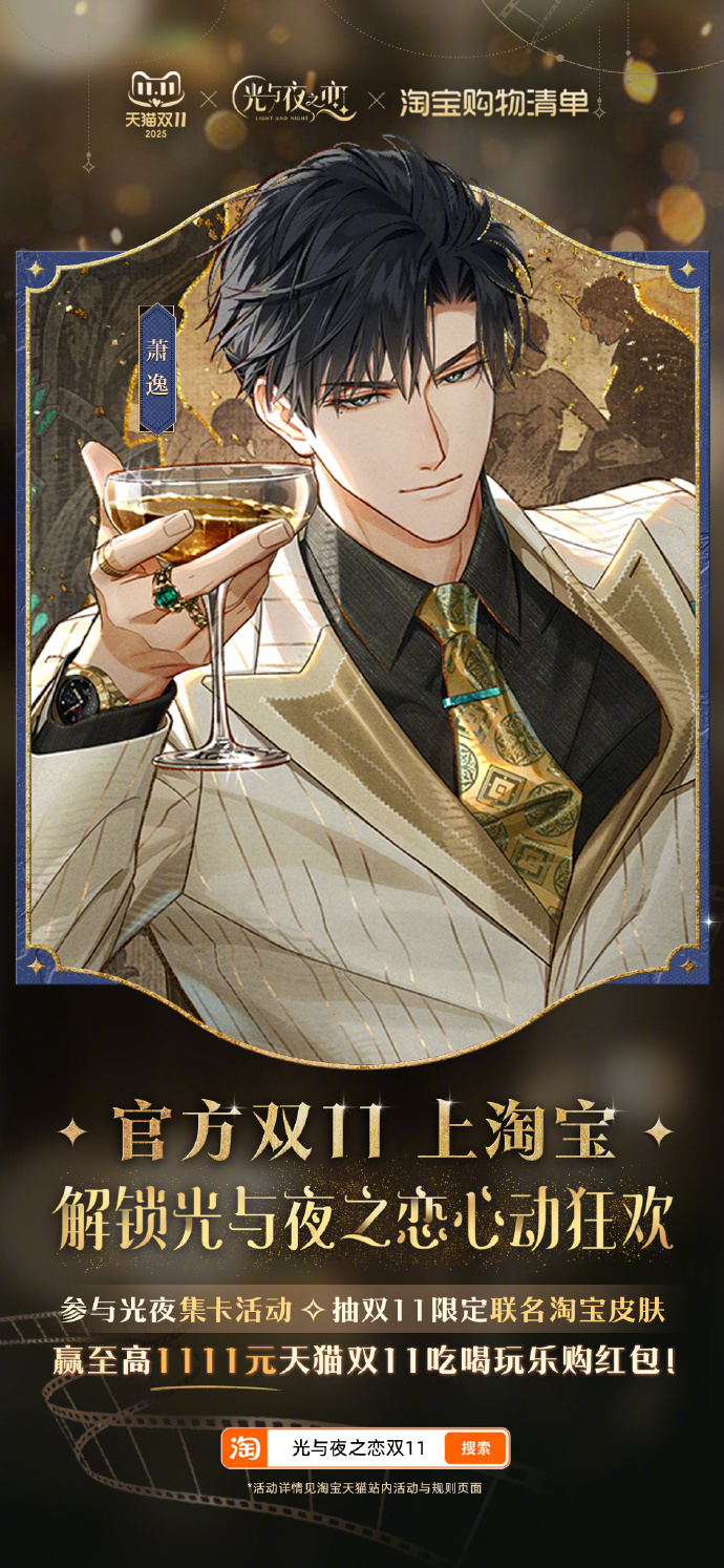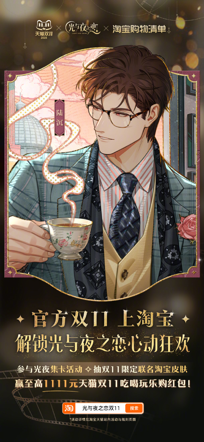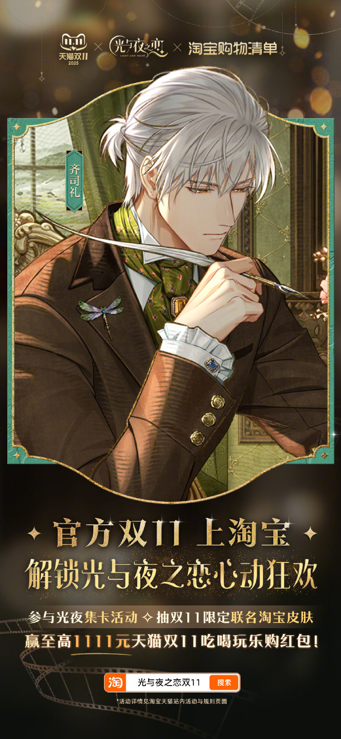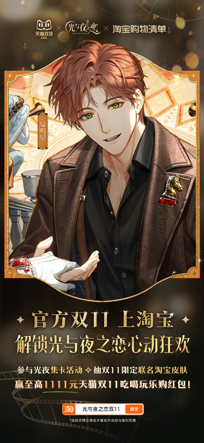 天猫光与夜之恋双11心动暴击!天猫竟然把五大主理人全请来了!萧逸、陆沉、齐司礼、查理苏、夏鸣星空降双11,这排面谁顶得住?!即日起至11月14日,上淘宝搜「光与夜之恋双11」参与集卡活动赢取最高1111元红包和限定周边,还有免费联名皮肤等你来领!更有线下狂欢巡礼:主题地铁站打卡、四城大屏点亮、百城楼宇广告…光影浪漫已铺满城市街头!快来参与打卡,分享你的心动瞬间吧!