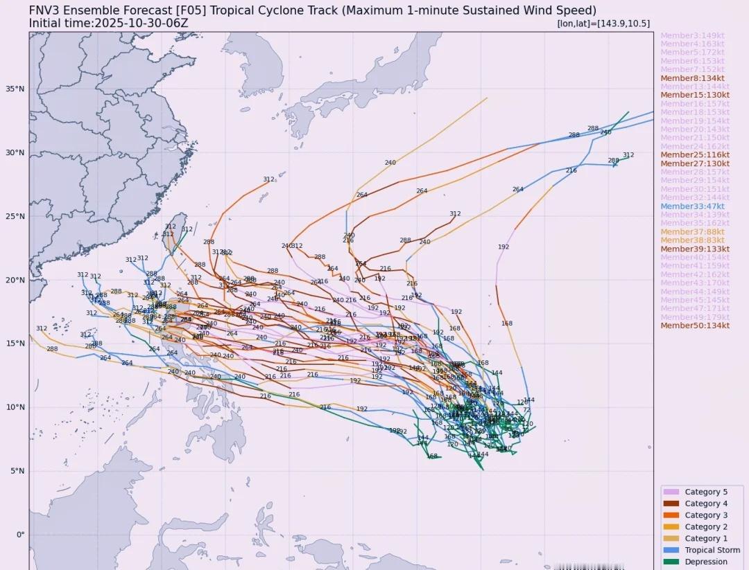 台风凤凰酝酿中,不能排除登陆我国可能性 根据AI歌谷模型fnv3,最新成员集合路径预报来看,未来路径趋向依旧不明,支持进入南海成员占多数,但也有支持登陆我国台湾成员,目前来看只是小概率,这个要看,未来在菲律宾近海北上转向过程,北方南下冷空气速度。天气 台风