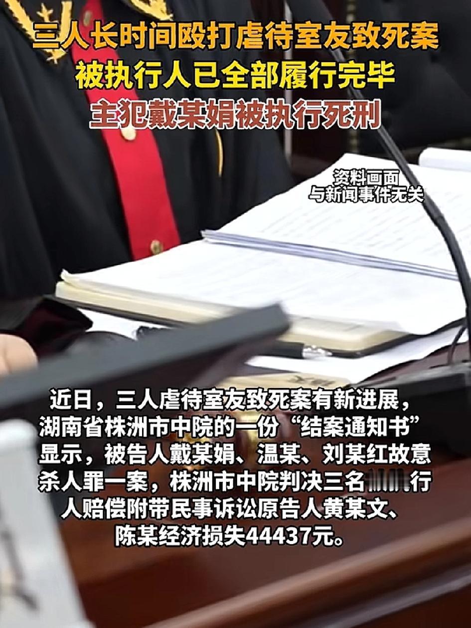 这案子,又有了新进展。 三名00后,把一个同乡室友折磨了整整一个月。 最后人没了,尸体被抛进河里。 最近,民事部分终于执行完赔了四万多块。 四万多,一条命。 案子大概都还记得。 戴某某,2002年生,湖南沅江人。 她跟李红、刘小娟、黄某四个人合租在长沙,靠送外卖、打零工过日子。 钱全在戴某某手里。 她是老大, 说一不二。 平常爱赌,输了就拉着她们一起。 谁输了,就得写欠条。 工资、家里寄的钱,全得上交。 慢慢地,黄某连吃饭都要看她脸色。 后来出事那阵,是因为外卖被投诉。 黄某耽误了时间,被平台罚了。 戴某某和另外两个就觉得她“拖后腿”, 那之后,几乎每天都在打。 铁棍、开水、热油、电线…… 不是一次,是持续一个月。 黄某想走,想去医院,也被拦着。 门被反锁,手机被没收。 到最后几天,她已经撑不住了。 那几个人还在网上搜“人快死前是什么样”。 知道她快不行了, 也没救。 2022年2月26日凌晨,黄某死了。 三人连夜把尸体装车,抛进河里。 十二天后,尸体被发现。 后面就是法院那套程序。 2024年12月13日,株洲中院执行死刑。 戴某某,故意杀人罪,死刑,剥夺政治权利终身。 现在民事赔偿刚刚执行完, 总共赔偿44437元。 网友评论一边倒支持 就是感觉赔四万,少了点。 死刑都感觉是便宜她了, 说白了, 恶不是一瞬间出来的。 是日复一日的羞辱、控制、冷漠堆出来的。 她们一起吃饭、一起住, 能笑、能闹, 但在那间出租屋里, 黄某已经不是人,是出气筒。 当父母知道自己的孩子遭遇到此等非人折磨致死,内心该有多痛苦,再多钱也换不回命。 那你怎么看? 不妨在评论区说说你的想法吧。