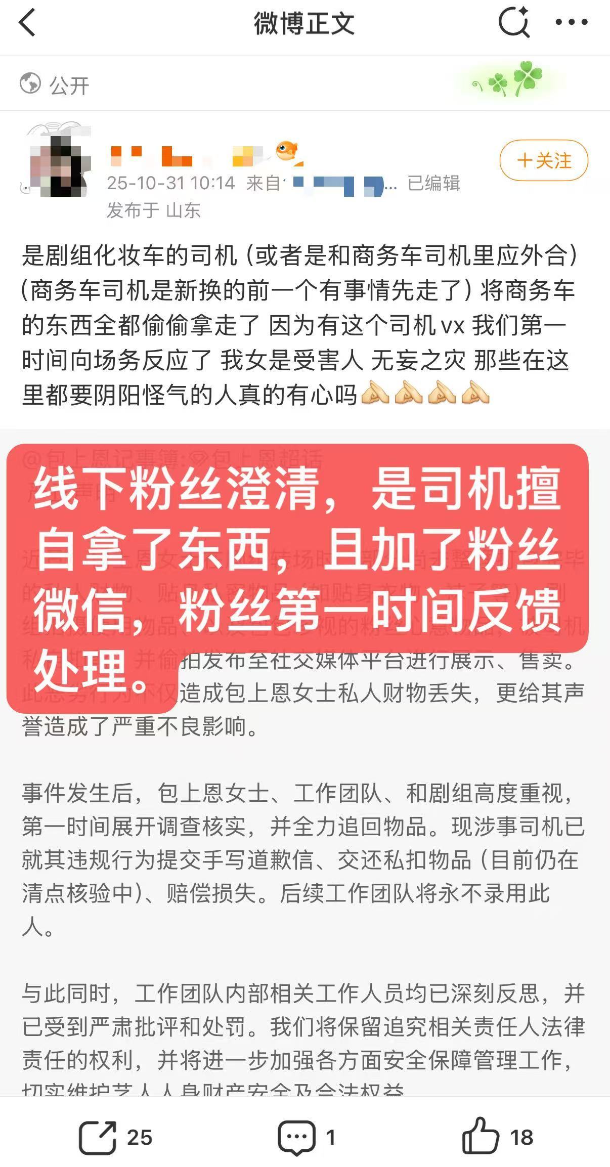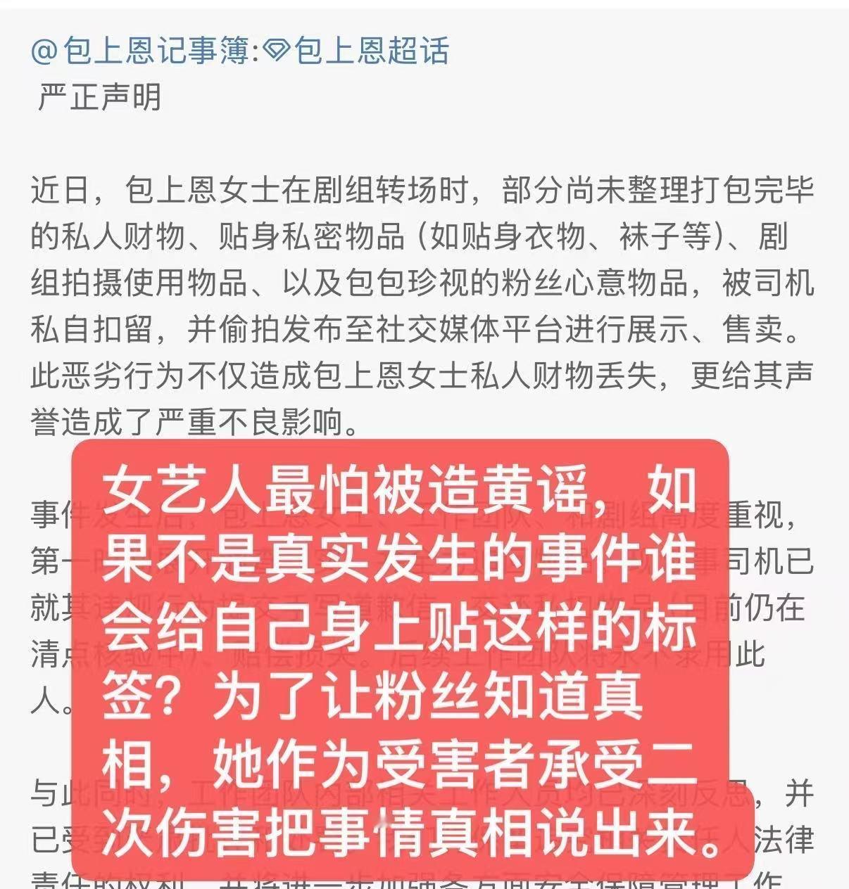 包上恩粉丝不限圈抽奖澄清。给女艺人造H谣要不得哈!原博:包上恩私人物品被司机扣留