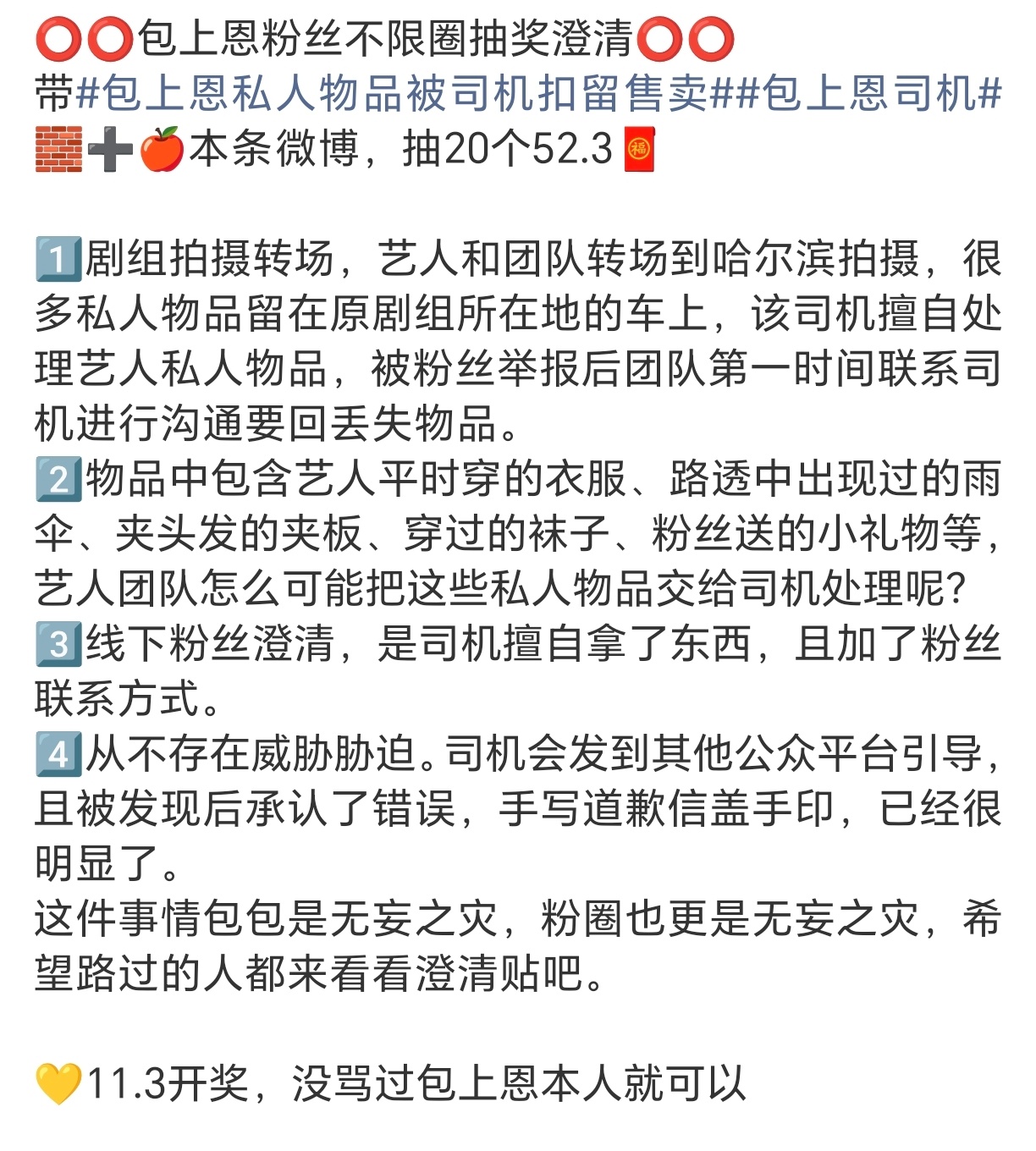 包上恩粉丝不限圈抽奖澄清。