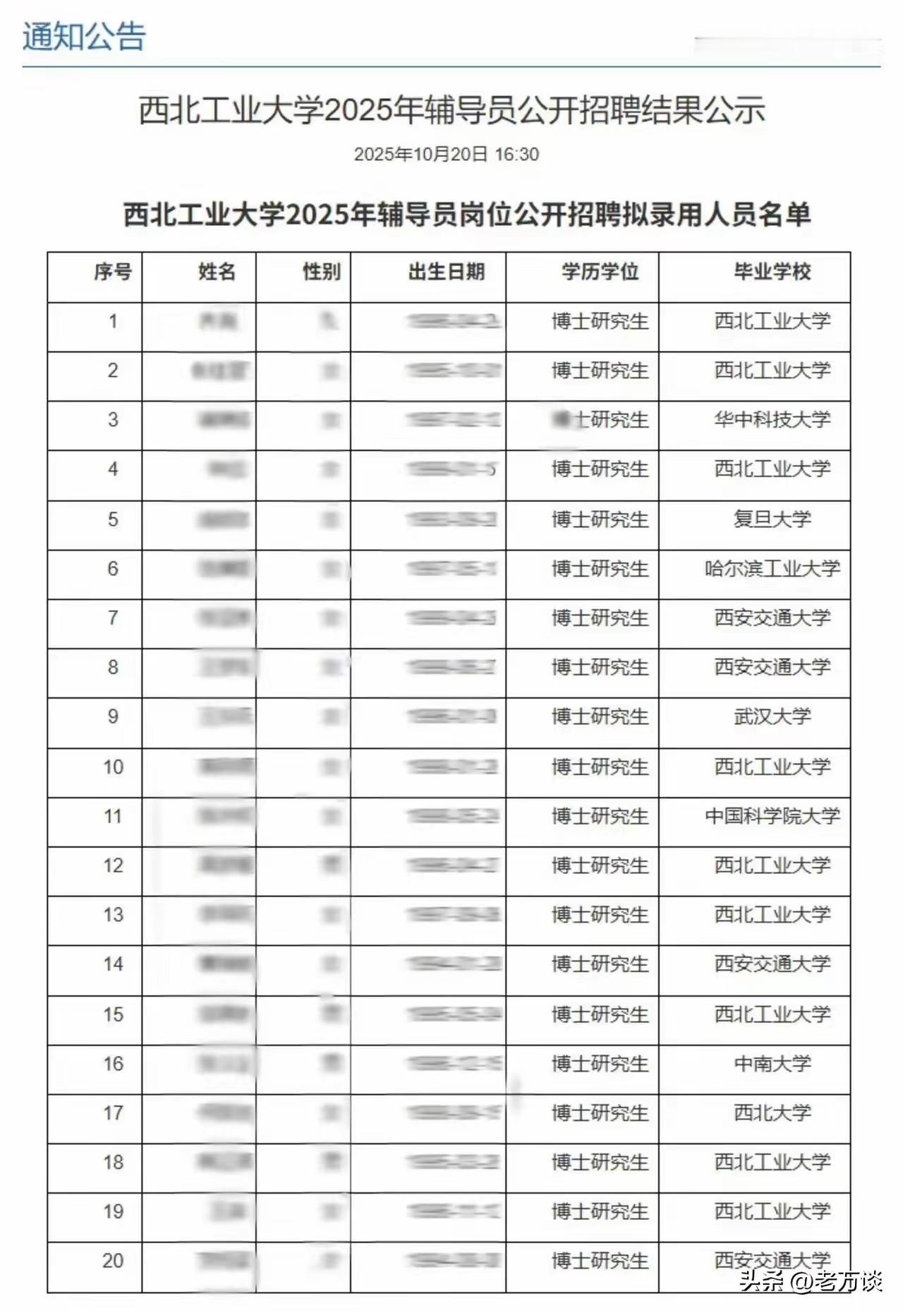 西北工业大学公布了2025年招聘的辅导员学历,都是清一色的博士毕业,而且都是985高校博士毕业,实在是太内卷了,现在的学历贬值实在太快了。还记得自己读大学的时候,辅导员基本上都是本科毕业,研究生毕业的都很少,现在辅导员都变成了博士毕业,而且还是名校博士毕业,现在学历贬值实在是太快了。关键是辅导员真的需要博士生吗?辅导员主要是对学生进行生活、学习上的指导,并没有具体的课程安排,主要是一些行政事务。这类工作真的需要博士才能完成吗?怎么这么多博士毕业生选择了辅导员这个岗位呢?为什么不选择去大学教书呢?在自己的专业领域大展拳脚,大展宏图,这样才能够实现自己的人生价值,即使去不了名校教书,去一些二本院校那也是绰绰有余,至少以后还有机会跳槽到其他名校,但是一旦当了辅导员,以后想要跳槽的机会就少了很多了。名校博士毕业选择大学辅导员究竟为何?