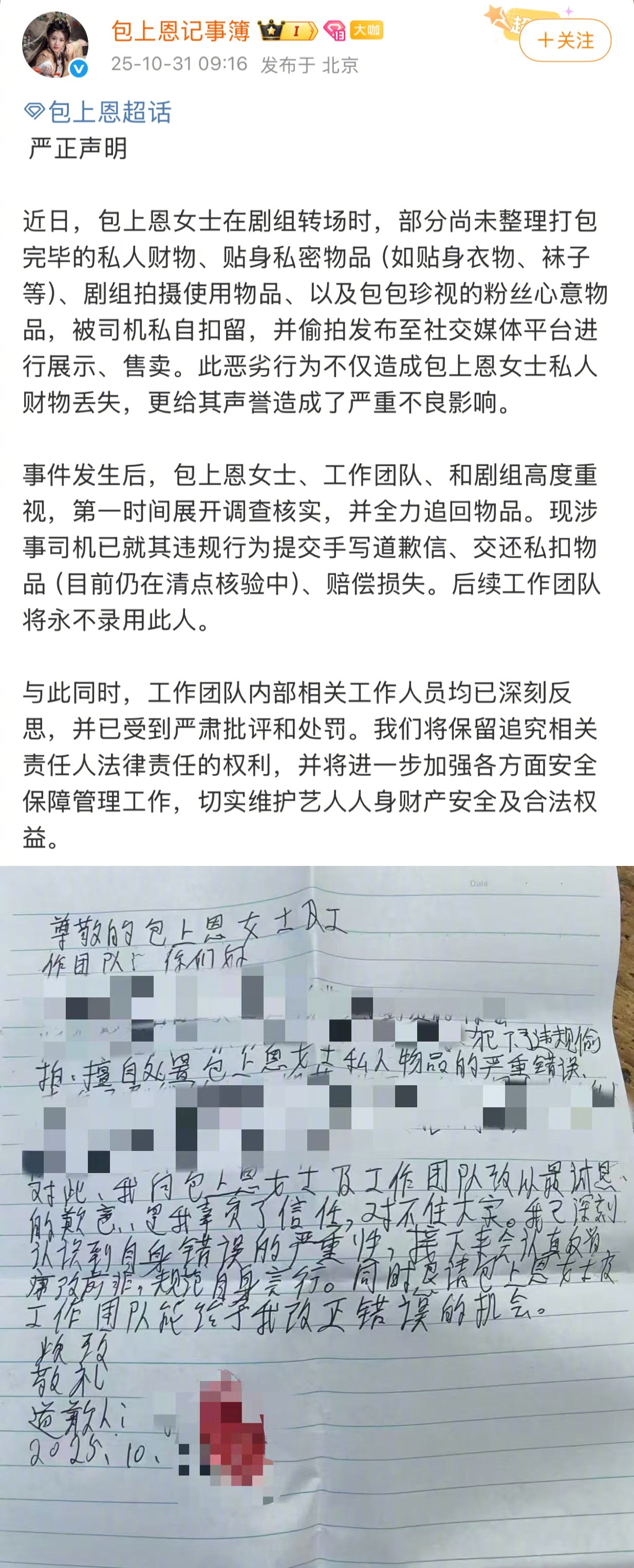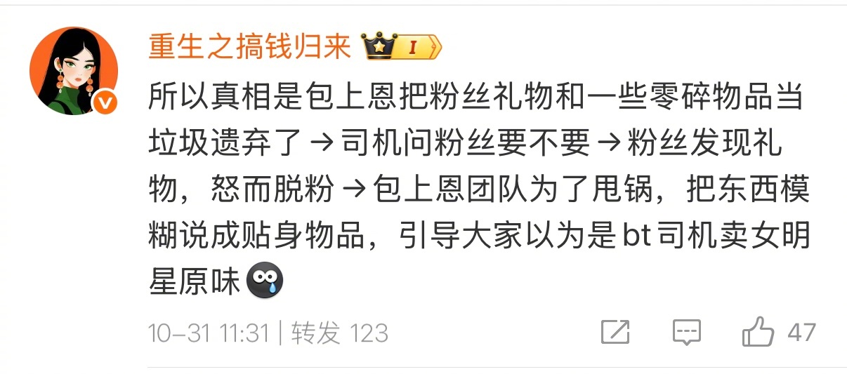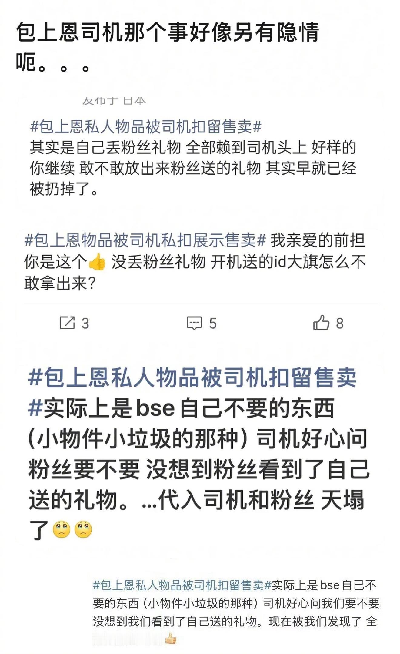 包上恩工作室说司机私自扣留贩卖了包上恩的私人物品和粉丝送的礼物,现在有粉丝说其实司机是被冤枉的,这些东西都是被包上恩自己扔掉的[傻眼]