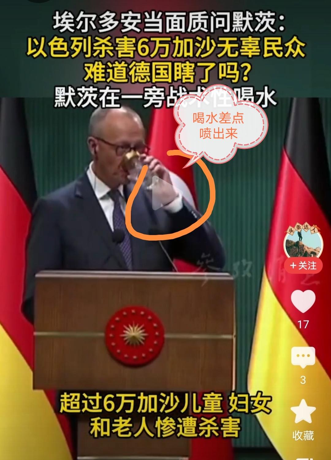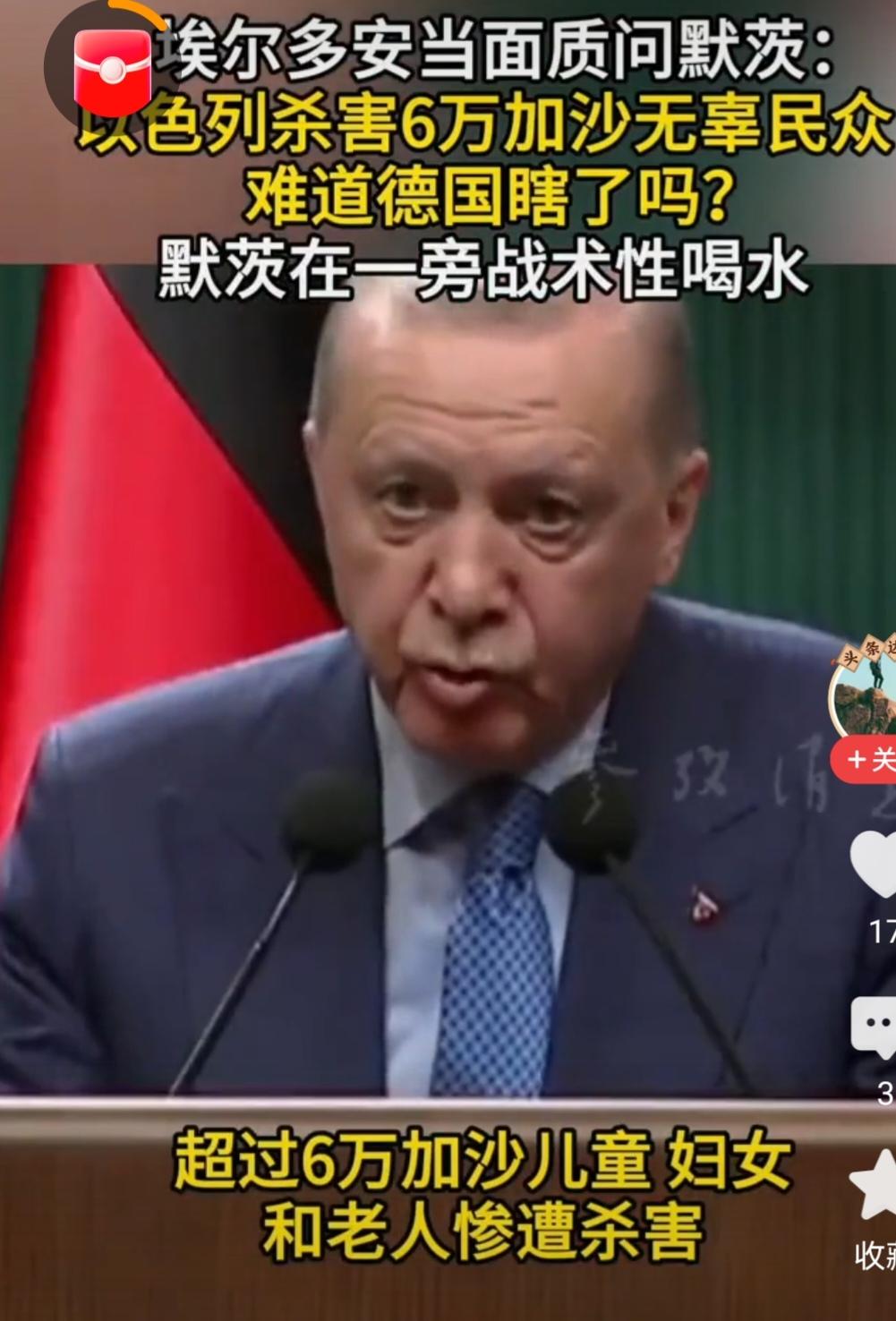 埃尔多安当面质问默茨:以色列杀害6万加沙无辜民众,难道德国看不见了吗? 据报道,当地时间10月30日土耳其总统埃尔多安在安卡拉与德国总理默举行的联合记者会上,猛烈抨击德国对以色列在加沙实施种族灭绝、饥荒与袭击行为视而不见。 埃尔多安称:“此次巴以冲突期间,超过6万加沙儿童、妇女和老人惨遭杀害,是以色列使用了炸弹等杀伤性武器所为,难道你们德国看不到这些吗?难道你们德国不关注这一切吗?”,而此刻,默茨只好尴尬的拿起水杯喝口水,以转移视线。可以说在外交公开场合,这种场面相当罕见。 其实,埃尔多安的指责并非空穴来风或亳无道理,在巴以冲突中正是美西方国家对以色列的偏袒及包庇,才使以色列在加沙的军事行动越来越无视国际法,使巴勒斯坦人民在战争中遭受惨无人道的灾难。这与美西方国家在俄乌冲突中的表现突显出“双重标准”而广受争议。